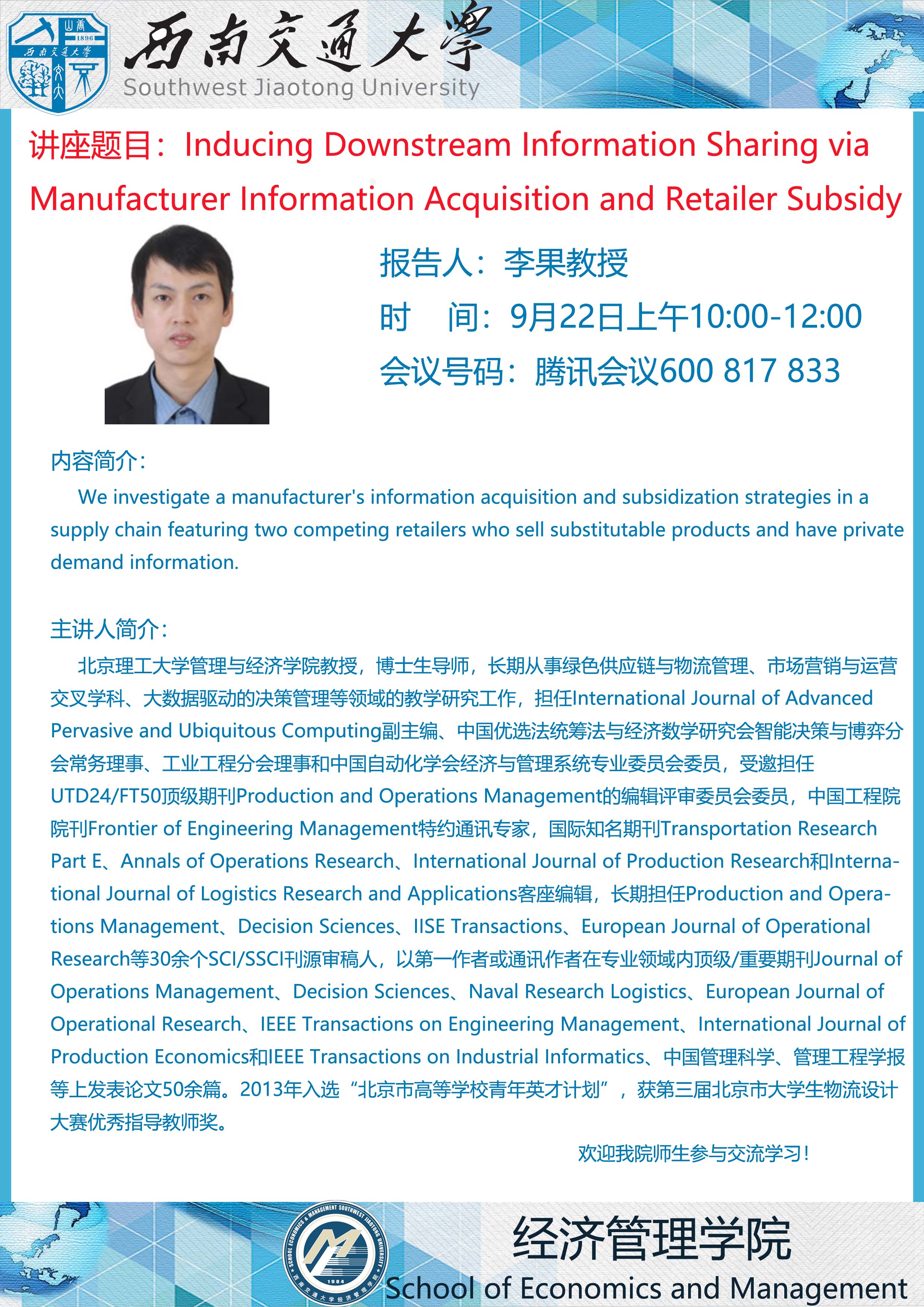 北京理工大学管理与经济易游体育 李果教授学术讲座
