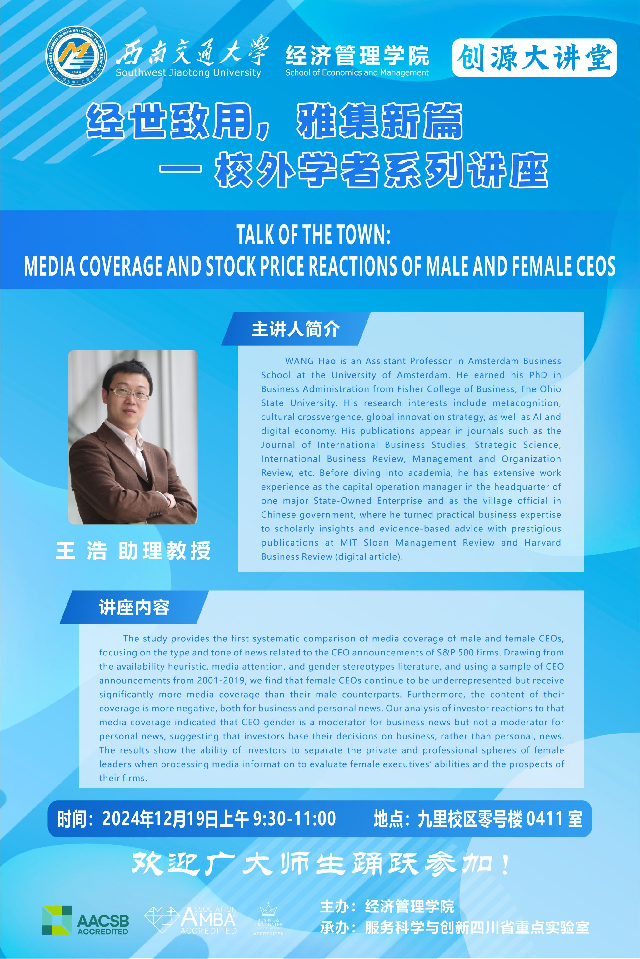 阿姆斯特丹大学商易游体育 助理教授王浩学术讲座