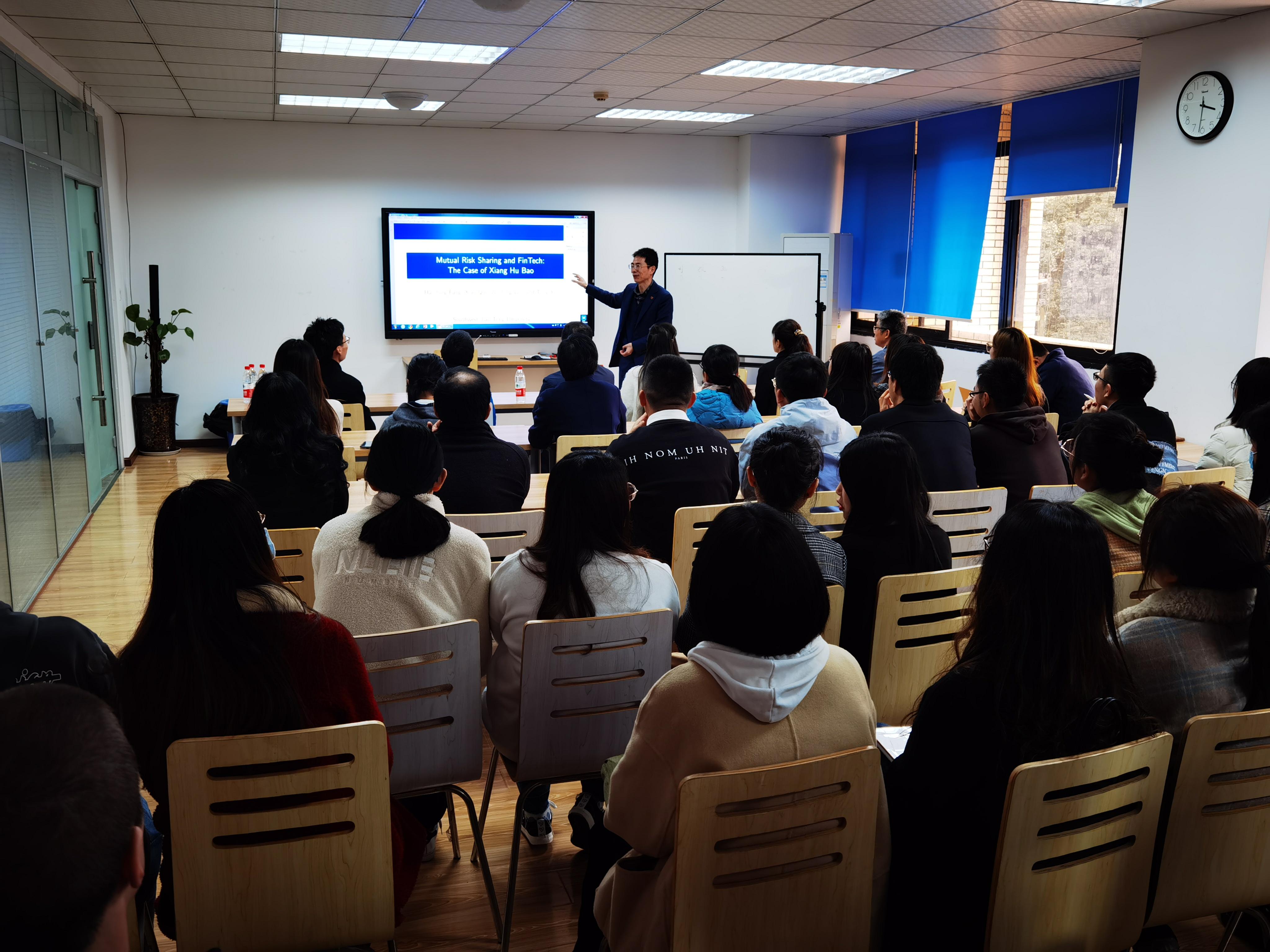 In the expectation of everyone, Professor Wu Wenfeng started this lecture with a relaxed tone. He first asked whether everyone had used "XiangHuBao(XHB)" and whether they understood its operating mechanism. In a lively atmosphere, he led to the research theme of his thesis-common risk sharing and financial technology: taking "XHB" as an example.