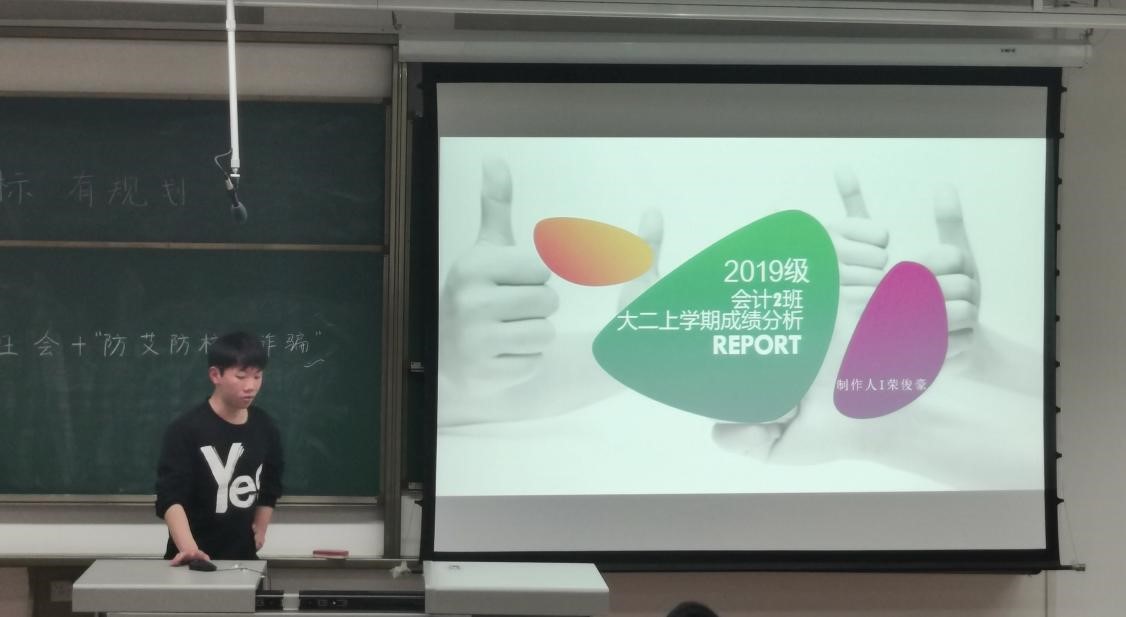 学习委员荣俊豪针对上学期期末成绩进行全面细致的总结和分析,通过横向对比专业各班级各科成绩平均分,分析班级同学专业排名和单科状元,对同学们一学期以来的学习情况表达了肯定,同时激励大家新学期再接再厉,勇创佳绩!