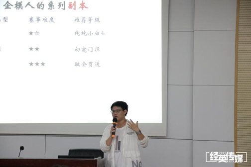 学生会主席刘锦陈、2021年企业竞争模拟大赛全国一等奖获得者庞硕以及2021年企业竞争模拟大赛全国三等奖获得者胡译文。会上,主讲人庞硕和胡译文通过分享比赛的亲身经历,为大家细致充分地讲解了本次大赛的相关事项,解答了大家心中的困惑。本次宣讲会不仅让同学们对企业竞争模拟大赛有了更加深刻的了解,还给予了同学们相关的比赛经验支持,让大家对比赛的进行有了初步的了解与掌握,调动同学们参赛热情的同时,也为培训会和比赛的顺利开展打下了坚实的基础。