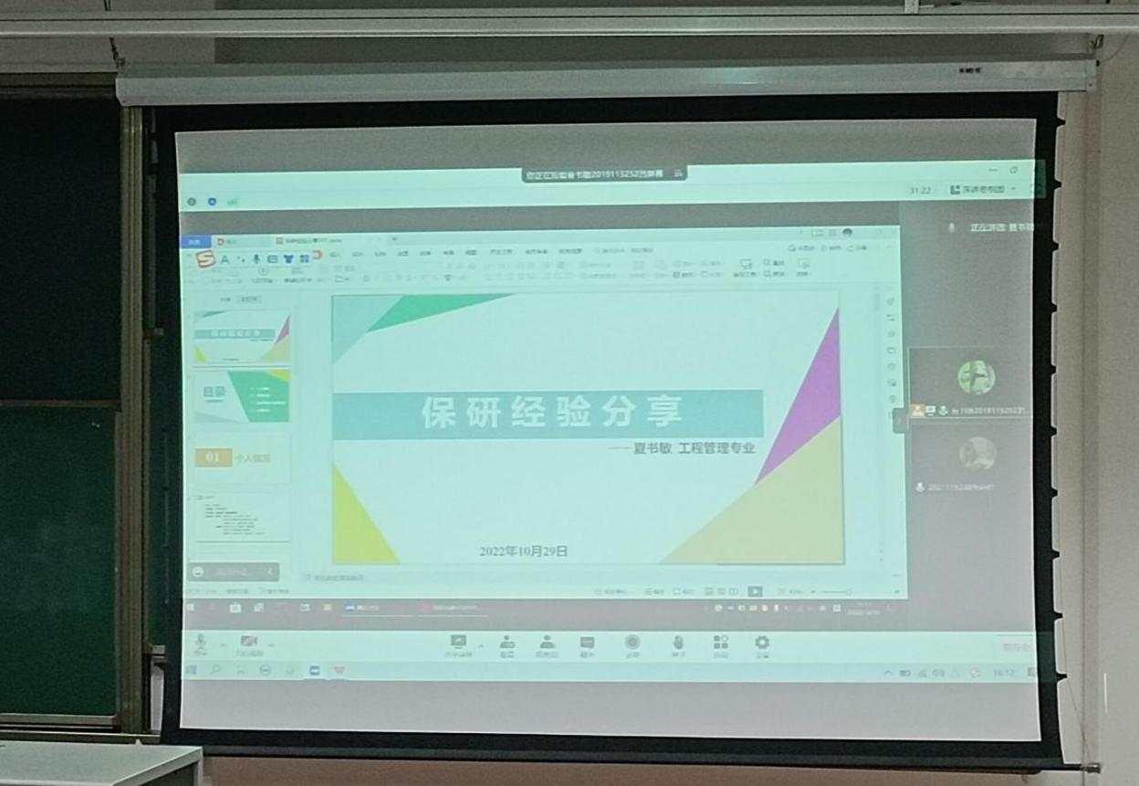 夏书敏学姐则和大家分享了她保研至南京大学的经验。学姐首先通过提出两个问题:“保研是什么?”、“什么时候开始准备?”,让同学们明确了保研前期的准备工作。同时,她向同学们提出了两点建议,一要自我评估,查漏补缺;二要信息收集,做好对保研基本概念与时间线以及院校信息等材料的收集。她还分享了自身的面试经验,让同学们了解了面试的具体过程。