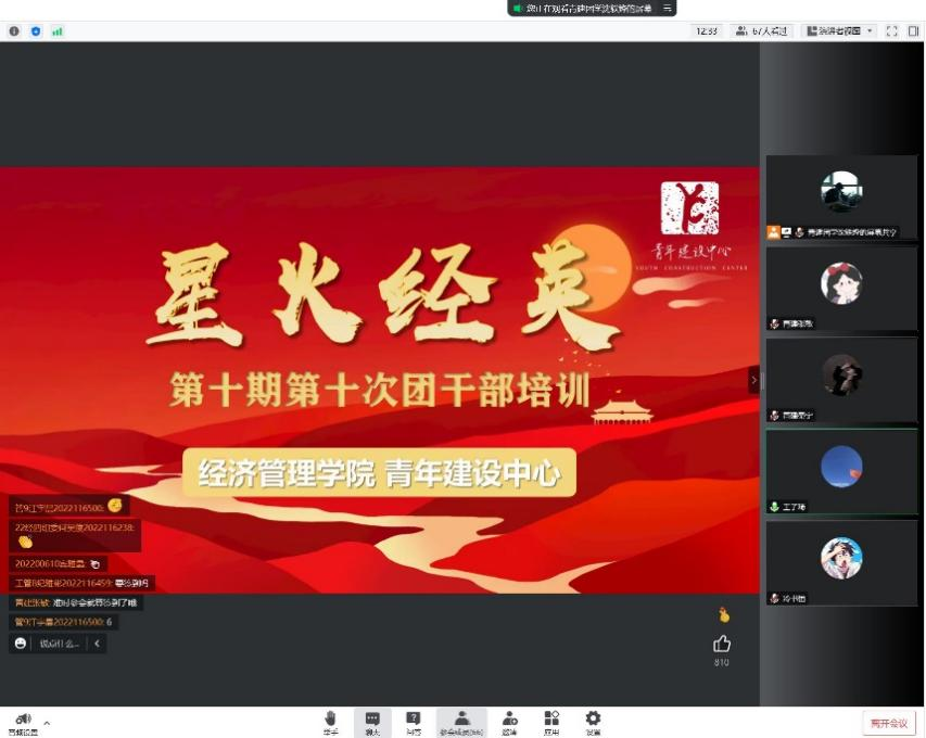于线上开展了“星火经英”计划第十期第十次团干部培训,本次会议由2022级辅导员王子琦组织, 2021级博士研究生冷书恒主讲,培训主题为“增强实现中华民族伟大复兴的精神力量”,旨在激励同学们弘扬伟大建党精神,争做新时代先锋力量。
