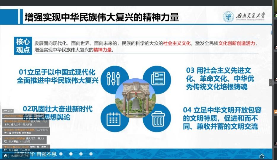 最后,冷书恒从四个方面介绍了如何增强实现中华民族伟大复兴的精神力量,希望同学们努力学习科学文化知识,不断增强自身精神力量,努力践行党的二十大精神,为实现中华民族伟大复兴的中国梦贡献我们这一代人的智慧和力量,创造属于我们这一代人的业绩和荣光。