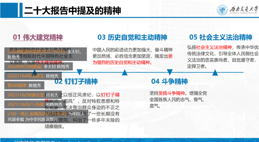 会议伊始,冷书恒向我们详细介绍了党的二十大报告中提及的精神,如伟大建党精神、钉钉子精神和斗争精神等,并向我们深刻地阐释了各种精神的深刻内涵。过程中,同学们积极交流互动,进行了更加全面深入的学习。