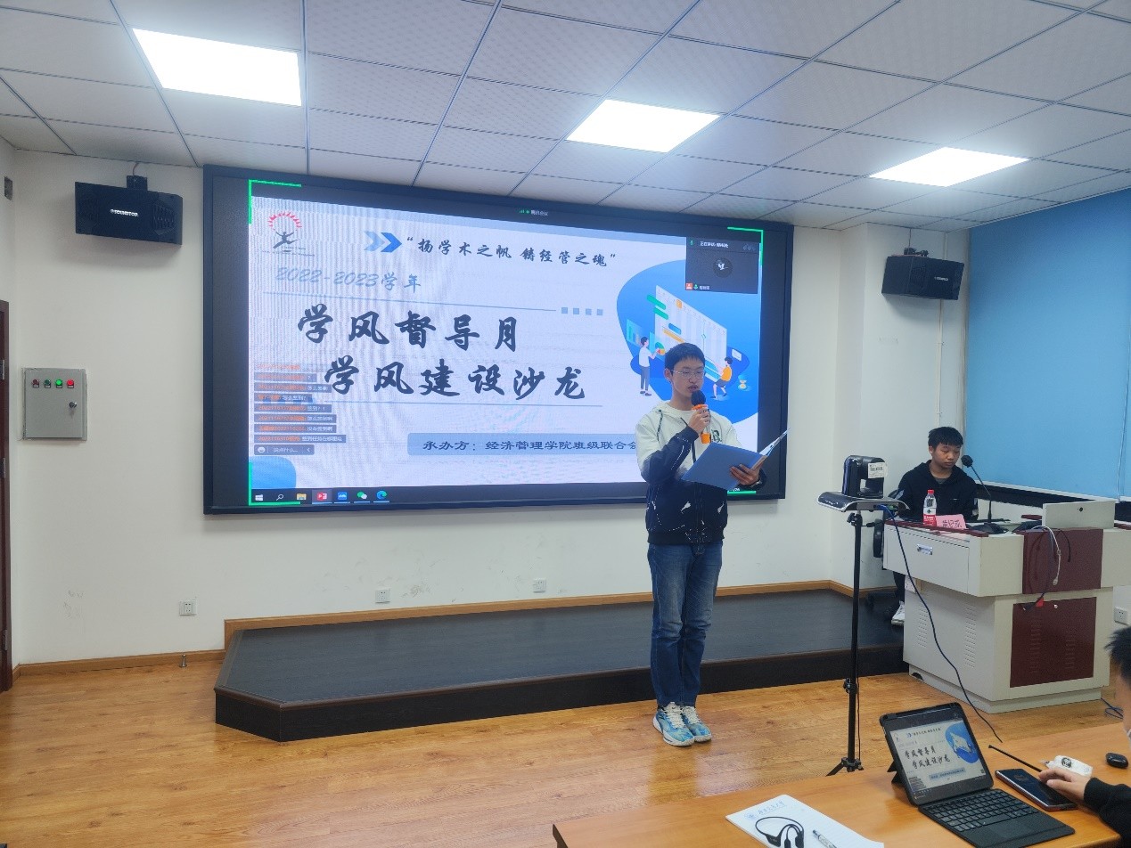 2022年11月26日19:30,“扬学术之帆 铸经管之魂”学风督导月学风建设沙龙活动在九里校区零号教学楼0318教室顺利举办,本次活动采取线上线下相结合的方式举行。第四届感恩中国近现代科学家奖学金获得者、现已保研至复旦大学的黄纪凯作为主讲嘉宾出席本次活动。黄纪凯结合自身经历,分别从保研、就业两个方面为本科2021、2022级学生分享了相关的经验与方法,帮助本科2021、2022级学生点明学习生活的重要节点、指明学习方向、拓宽视野、扫除盲区,从而更好地进行大学生涯规划。