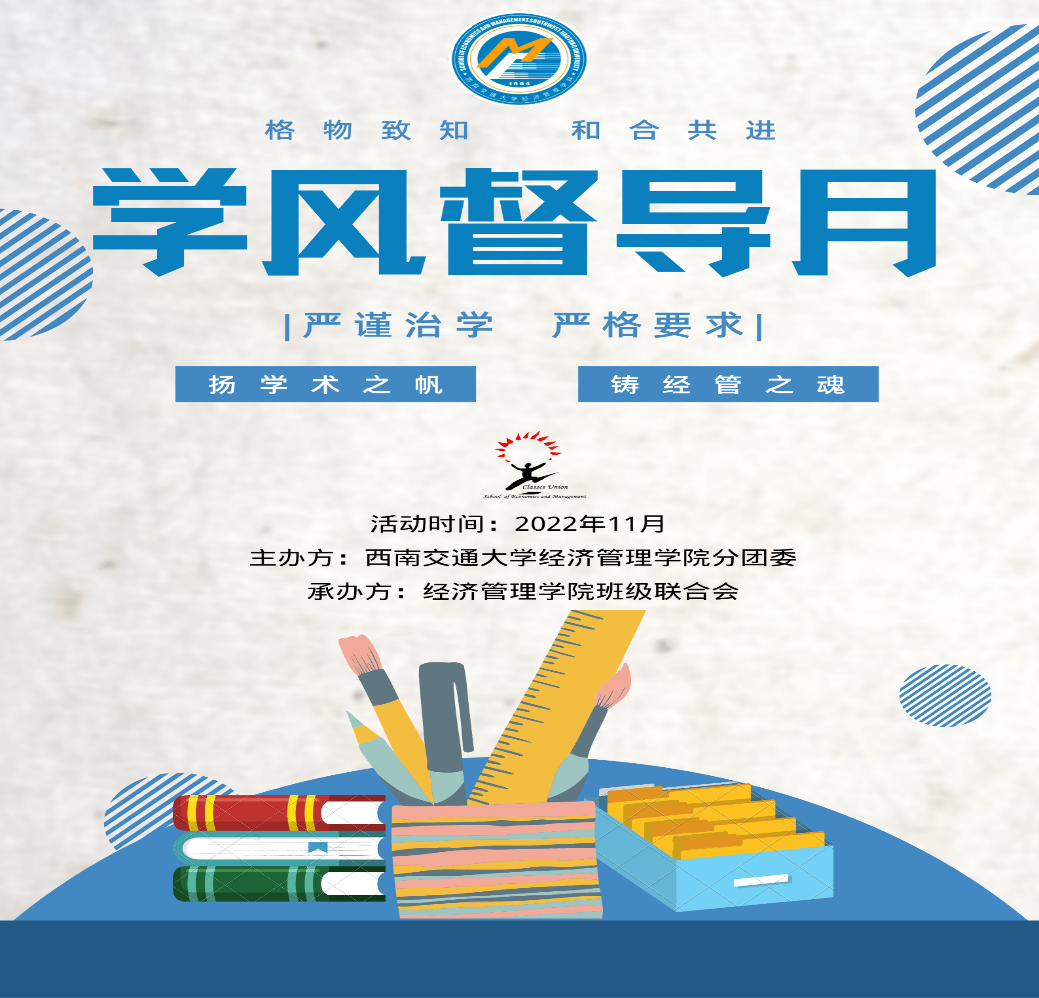 2022年11月7日,“扬学术之帆 铸经管之魂”学风督导月活动正式开始。本次活动历时一个月,主要包括课堂督察、学风建设活动、中期学委交流会、学风建设沙龙、决赛答辩系列环节。活动对象为易游体育-易游体育官方网站-YY SPORTS