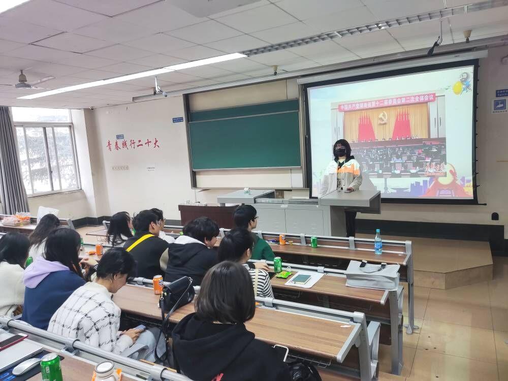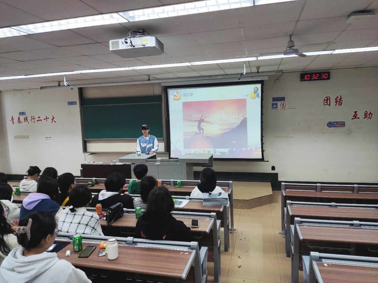 随后,班长彭琳芮带领全体同重温关于党的二十大的理论知识,进一步学习了过去五年的工作和新时代十年的伟大变革,以具体的数字向同学们展示了我国近几年的伟大成就。同时,她提出作为新时代的青年,我们要勇于担当使命,肯吃苦,为祖国发展出自己的一份力。