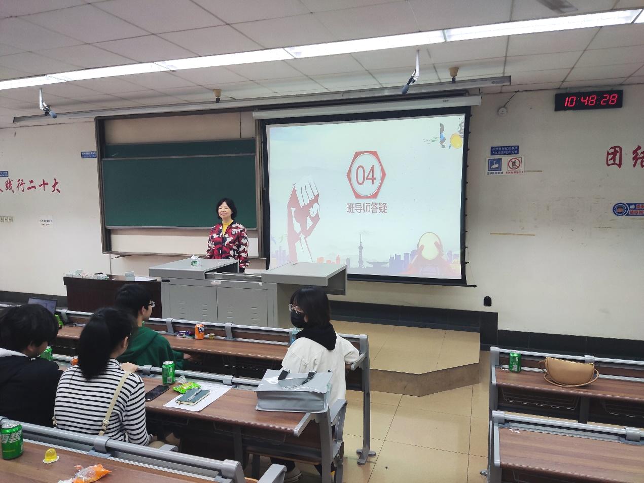 最后,班导师郑亚非对同学们会前提出的问题做了详细的解答。她就同学们的学习生活和未来规划提出了建议。她强调,同学们在注重自己学习的同时,也要多参加竞赛和志愿服务活动,学会劳逸结合,减少焦虑。对于未来的规划,她表示,要提早做好准备,丰富自己的经验,多了解读研和就业的信息、形势,找到适合自己的方向,制定计划表,脚踏实地向前迈进。