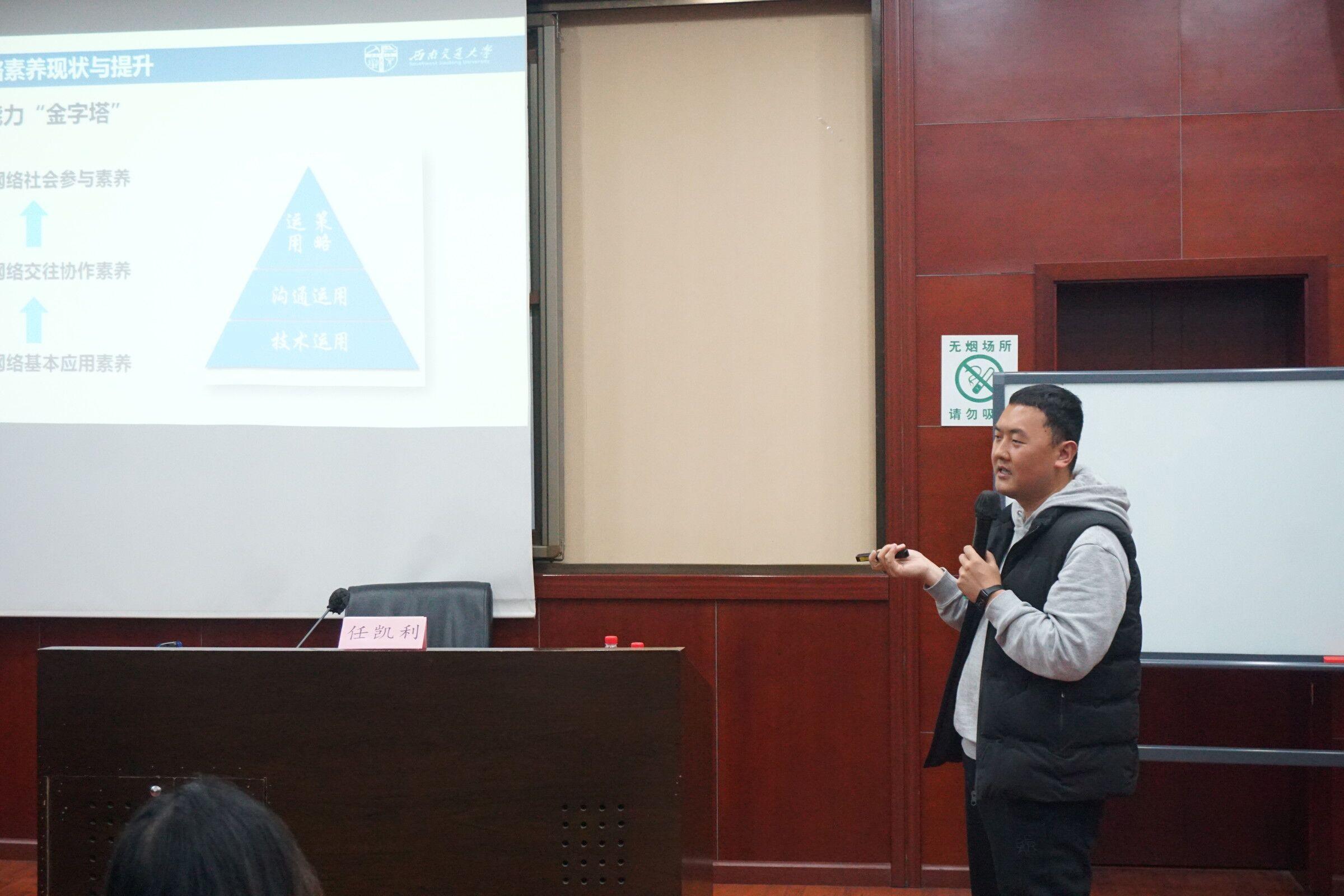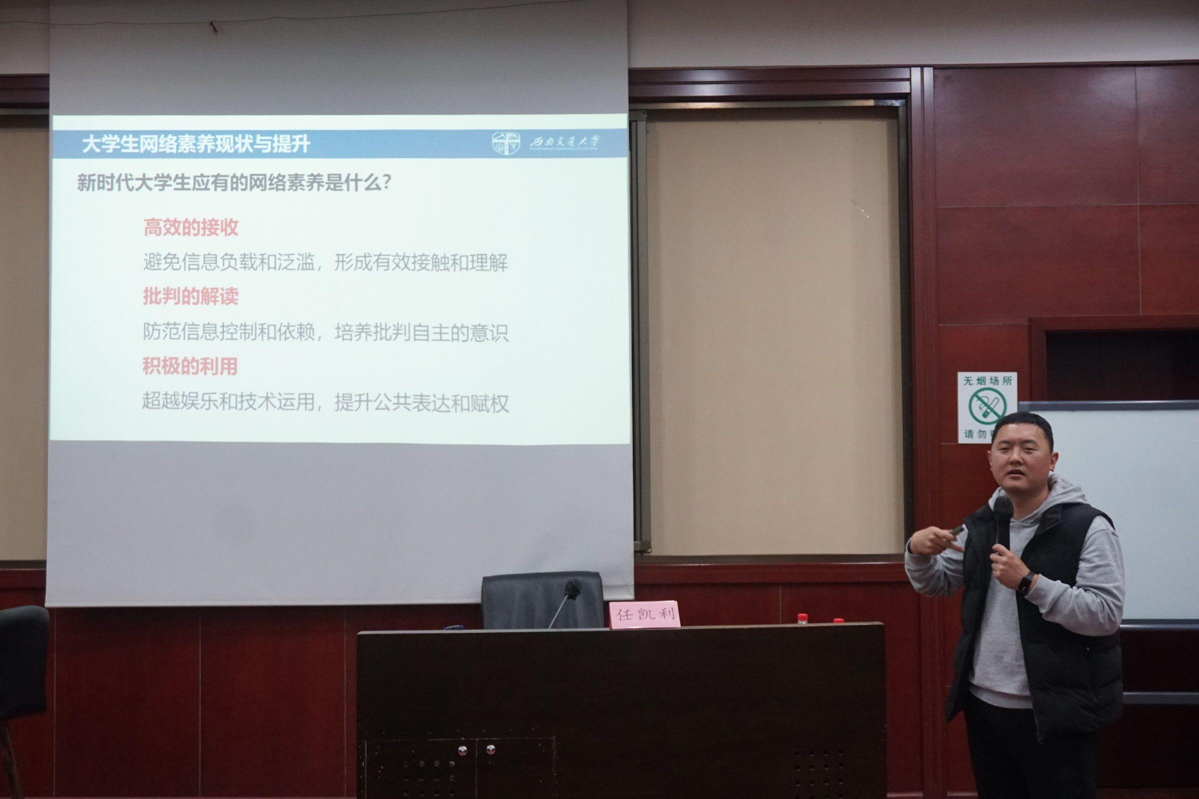 于J0224开展了“星火经英”计划第十一期第二次团干部培训。本次培训由西南交通大学团委兼职副书记,茅以升综合办公室主任、校青年讲师团成员、交大Kelly说网络思政工作室负责人任凯利主讲,主题为“与新媒体共舞——大学生网络素质提升”,旨在帮助同学们提升网络素养,合理运用各种新媒体。