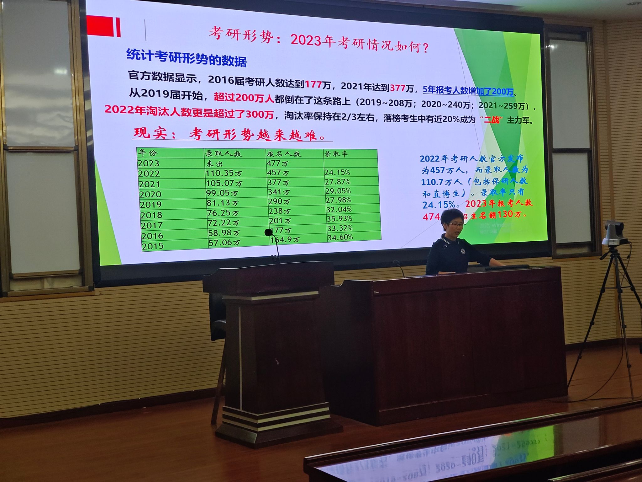 学生考研的一些基本情况。在毕业去向方面,王老师介绍了大学生毕业时可能有的去向选择,重点介绍了升学这一选项,国(境)内升学及选择和出国(境)升学两种选择及不同。
