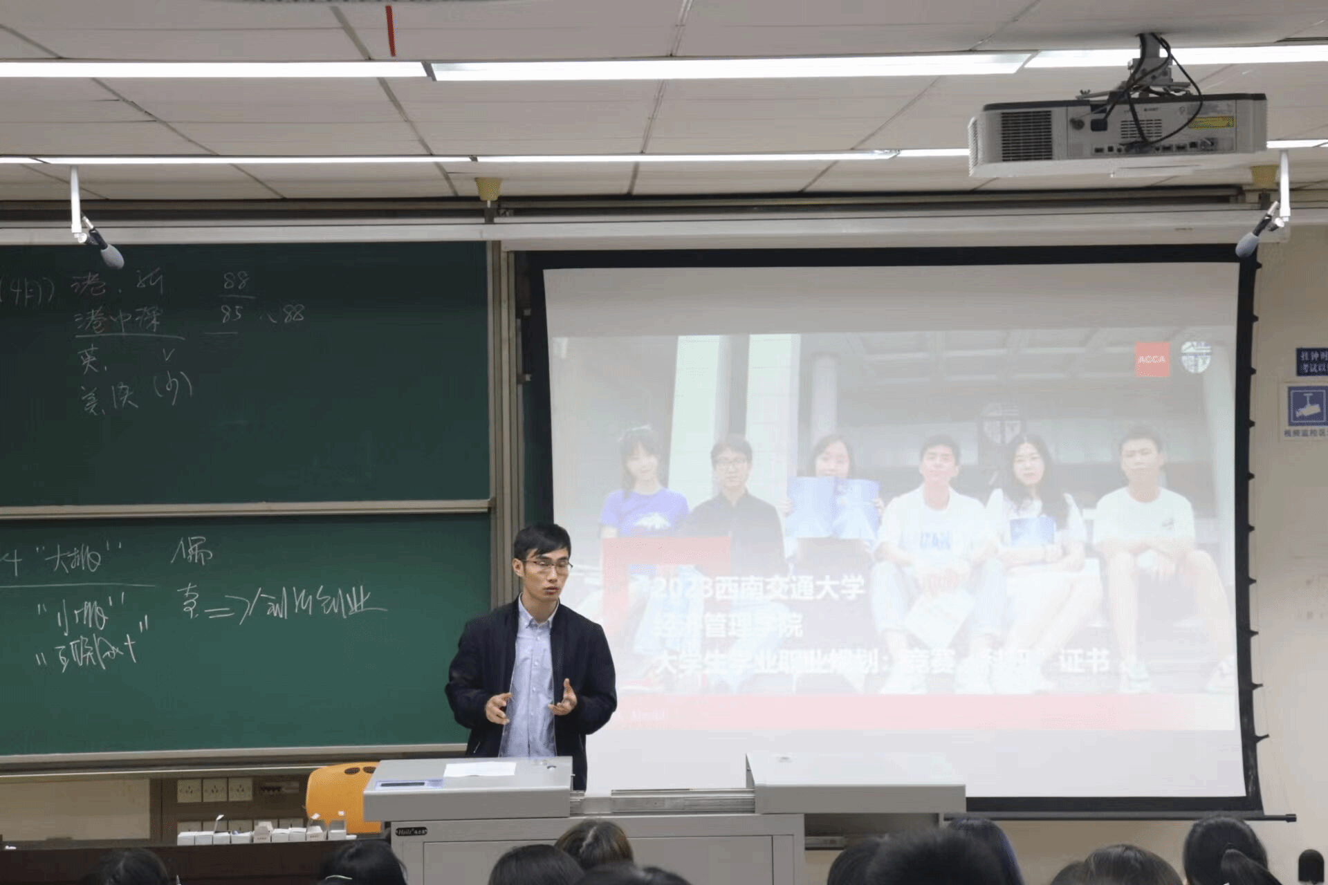 最后,杨言鑫老师向同学们仔细地介绍了西南交通大学ACCA方向班,向同学们介绍了ACCA课程体系,同学们了解到国际会计师证书体系,建议大家尽早为自己的职业生涯做全面规划。在辅导员苏扬老师的补充之后,本次生涯规划教育宣讲活动圆满结束。同学们对自己的学习生涯有了更全面的规划,也将在学业路上行稳致远。