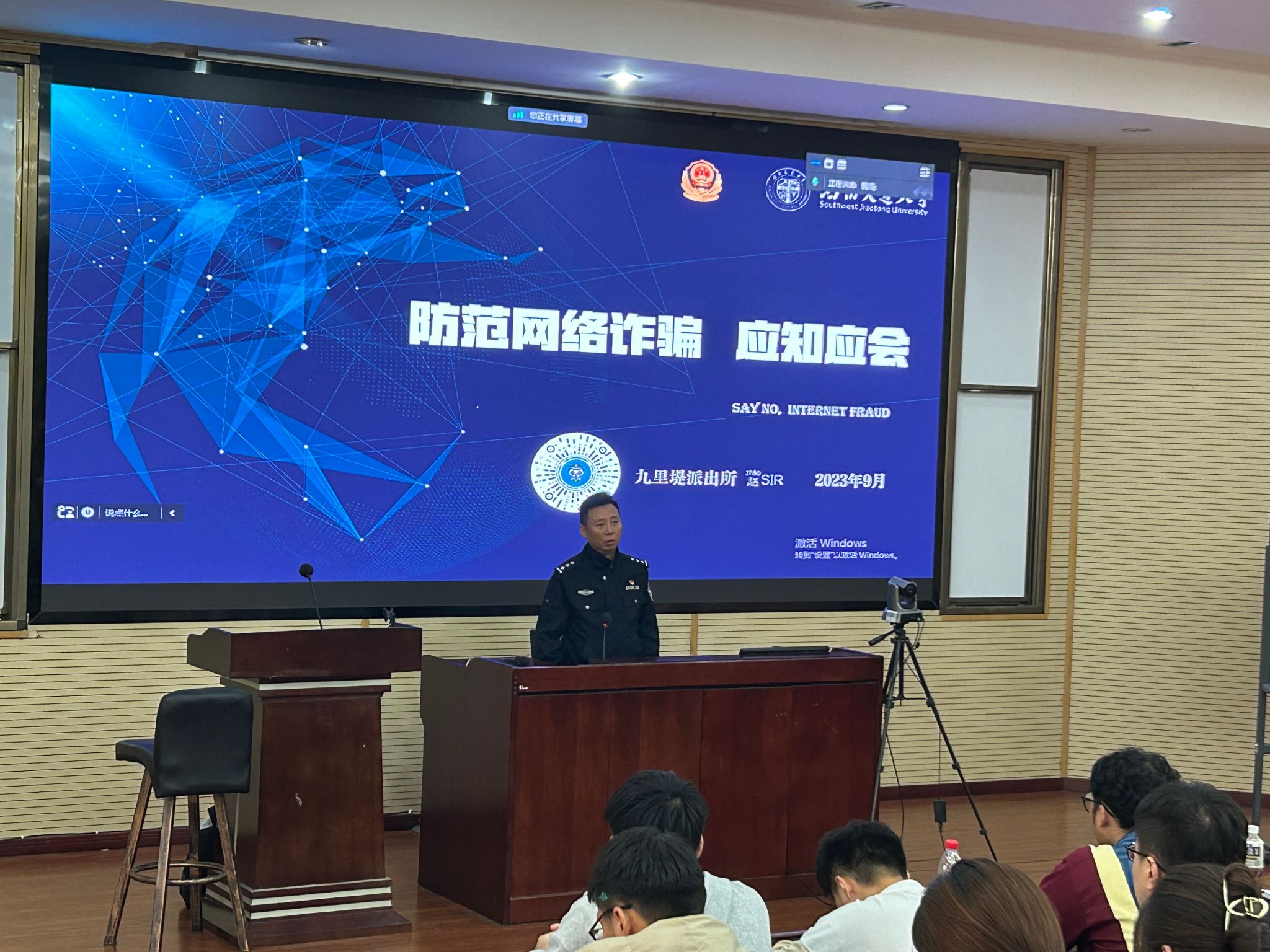 邀请九里堤派出所民警为全体研究生新生开展了一场反诈讲座。讲座邀请到了九里堤派出所具有多年防诈经验的民警赵磊主讲,研究生辅导员贺小轩、李勇也出席了讲座。