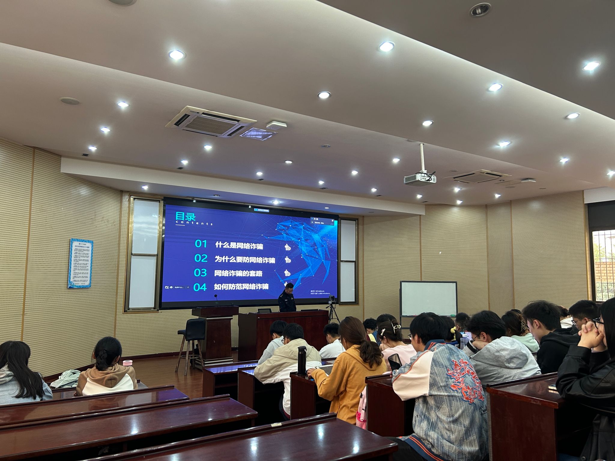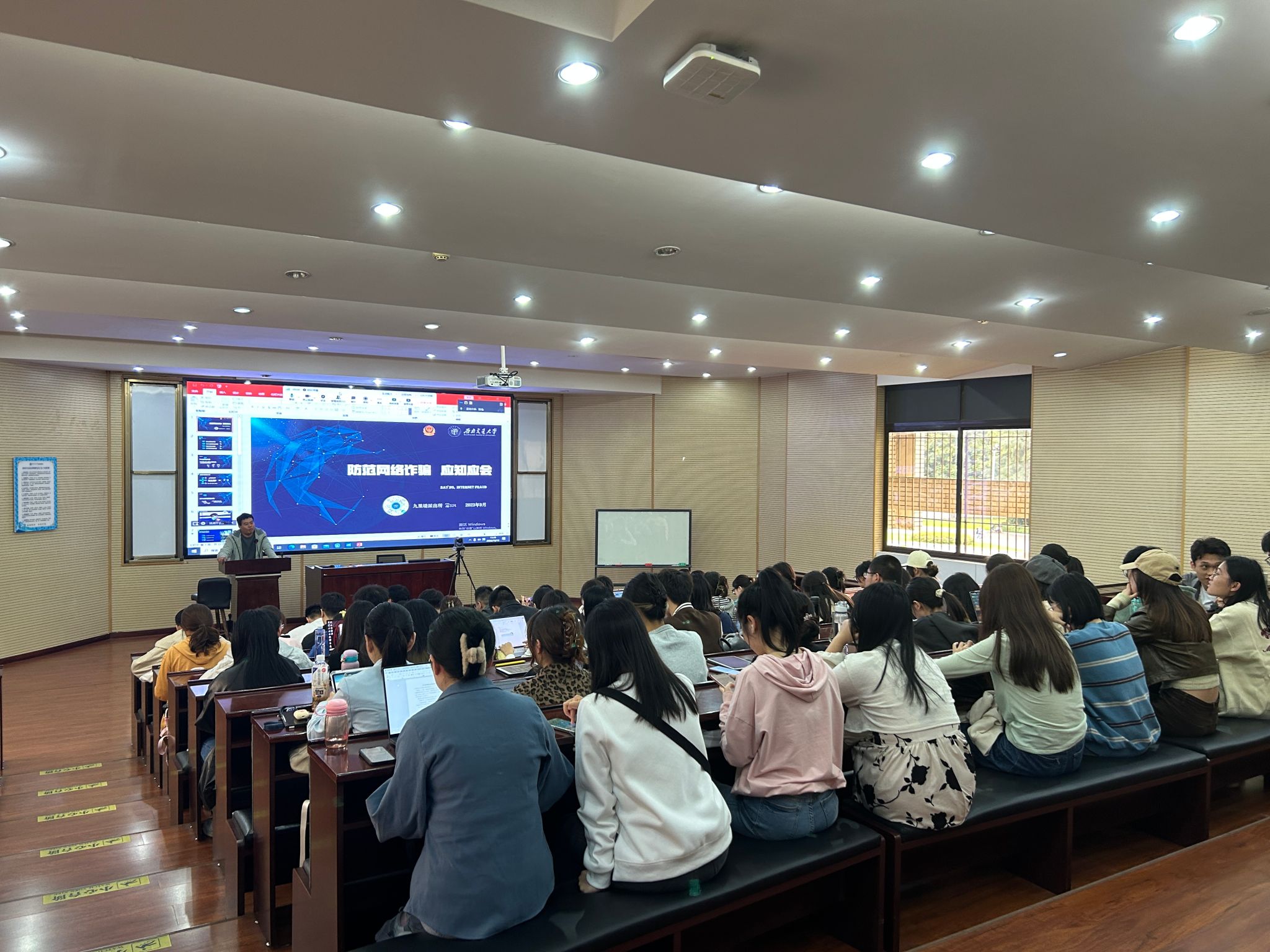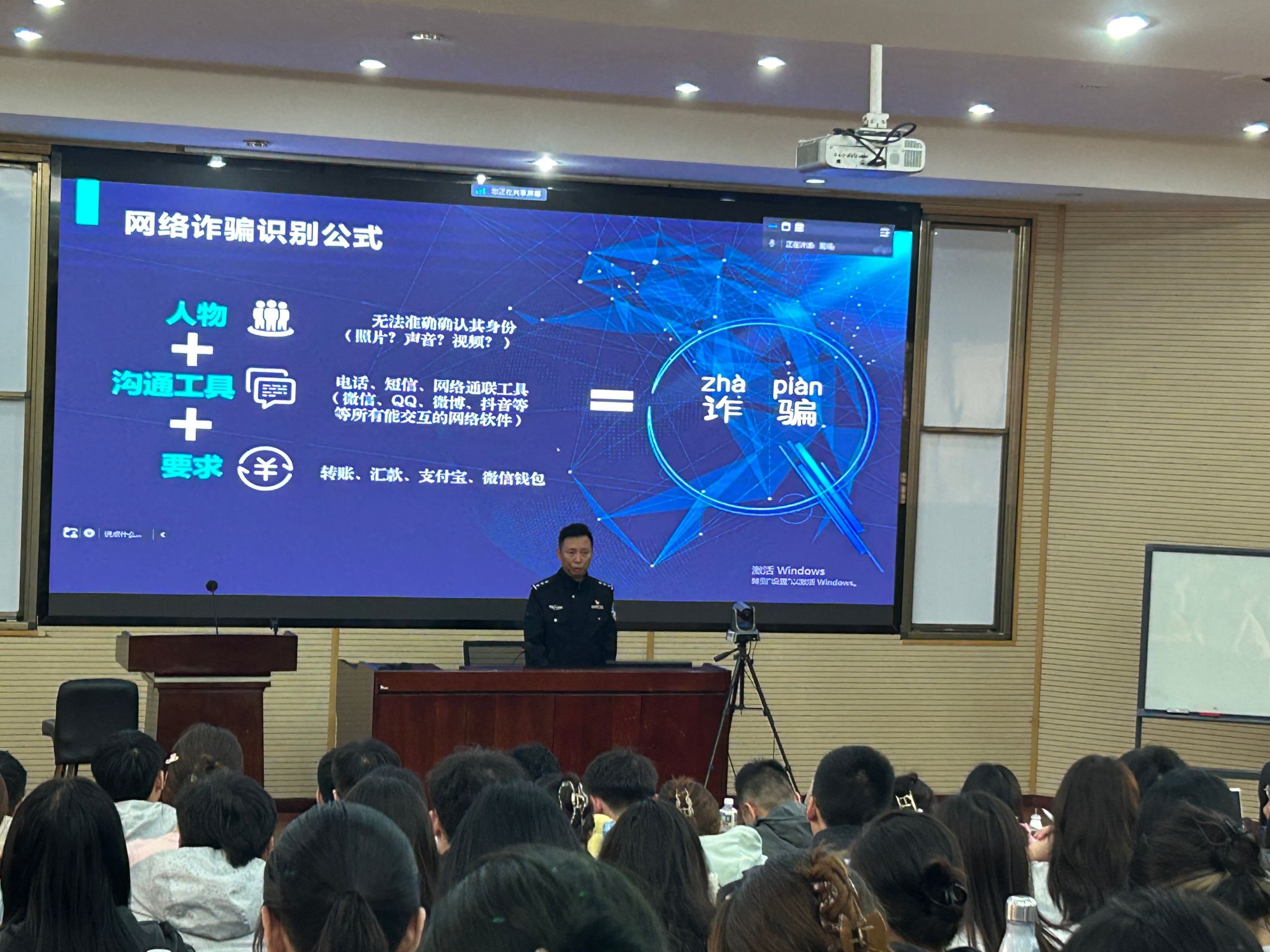 辅导员李勇叮嘱新生同学们,要提高对电信诈骗的重视程度,要建立起防诈骗的意识,也要从以往的实际案例中汲取经验和教训。紧接着赵警官以“防范网络诈骗 应知应会”为主题,从4个方面向大家普及了防范电信诈骗的基本知识,系统阐述了“什么是网络诈骗”,“为什么要防范网络诈骗“。