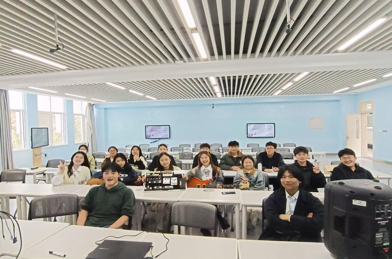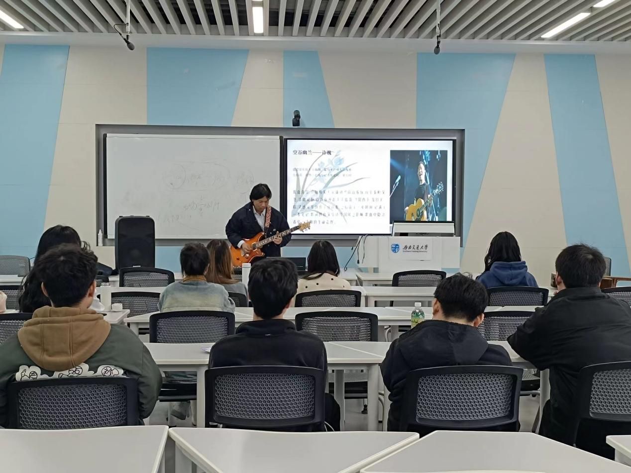 “音乐下午茶”出品团队为班级同学带来"吉他菜单——和你在交大的街头走一走",首先由周玉豪同学讲述吉他的相关知识,携团队其他成员一起为大家演奏著名吉他曲,最后讲演团队带领经济一班全体成员一起弹奏吉他,激发同学们对音乐的热爱。