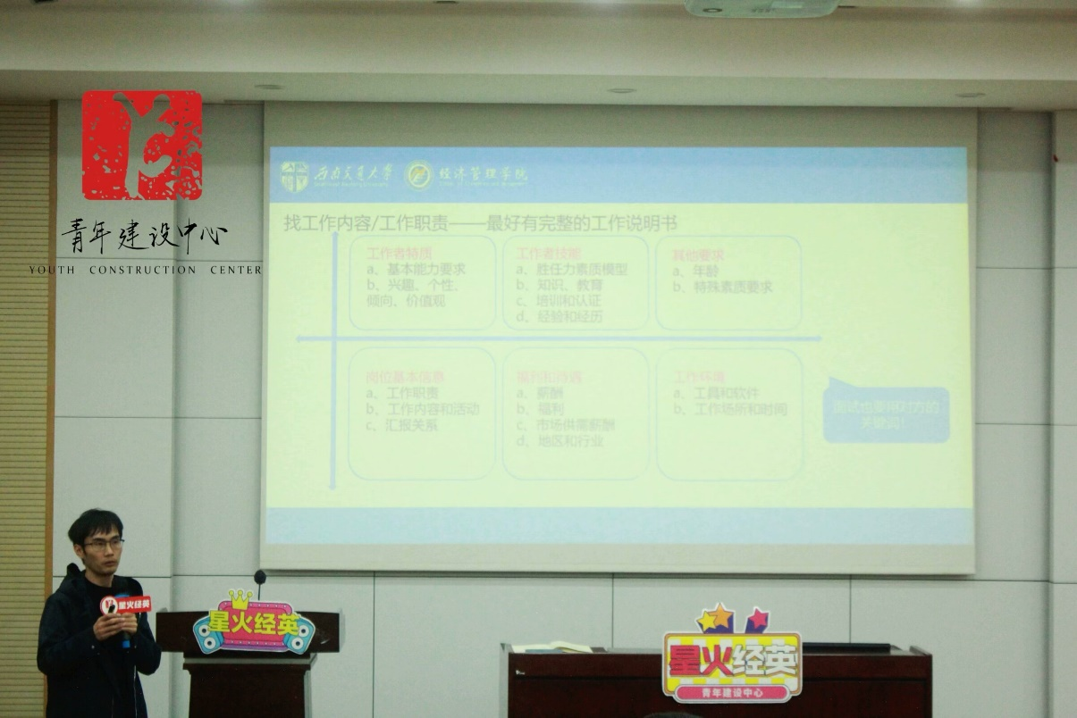 接着,苏扬老师特别强调,团干部们在择业上应以新观念打开就业新天地,同时也要深耕我们热爱的专业。最后,苏扬老师向团干部们详细分享了个人求职经历,他通过个人经历分析求职流程,分享求职心得,鼓励大家提前对职业生涯进行规划。