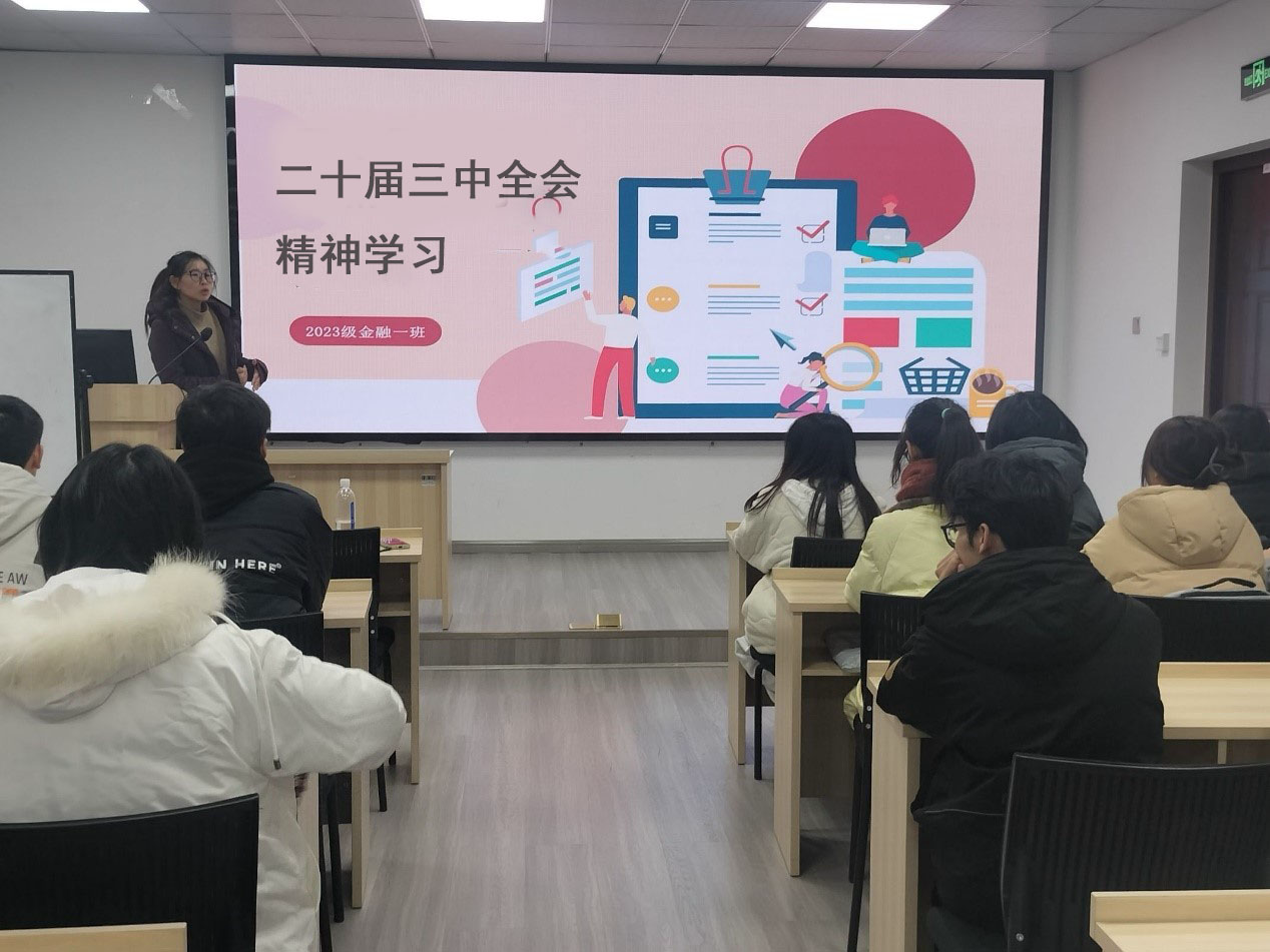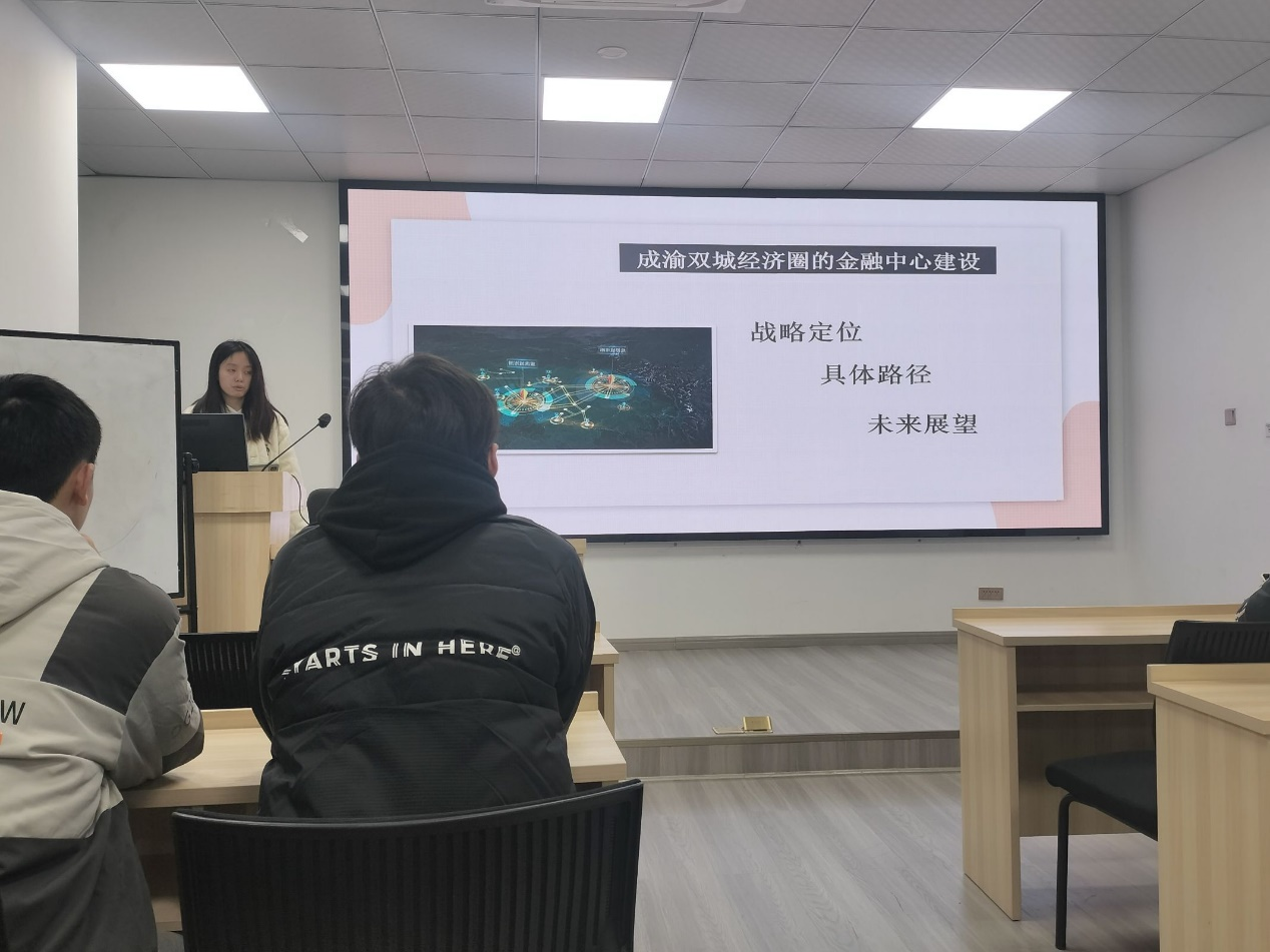 团委书记贾佳老师带领同学们学习了党的二十届三中全会精神,同学们围绕推动金融高水平对外开放、成渝双城经济圈金融中心建设等方面进行了深入学习和讨论。