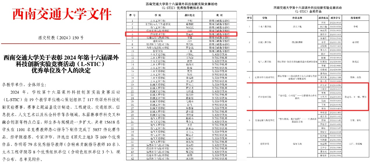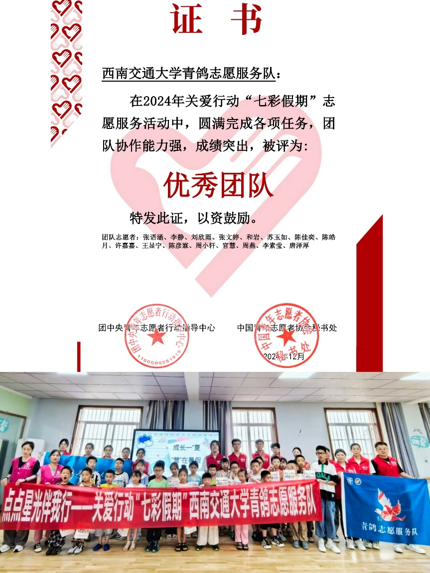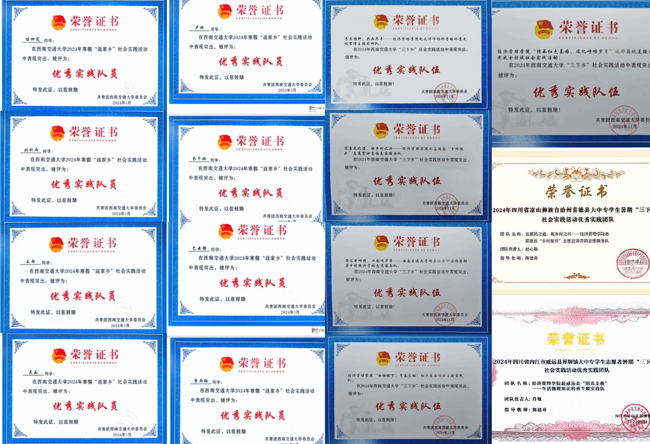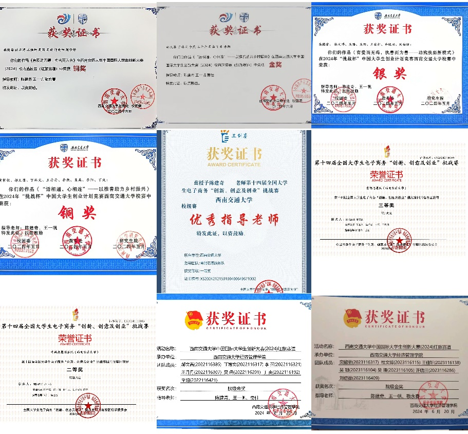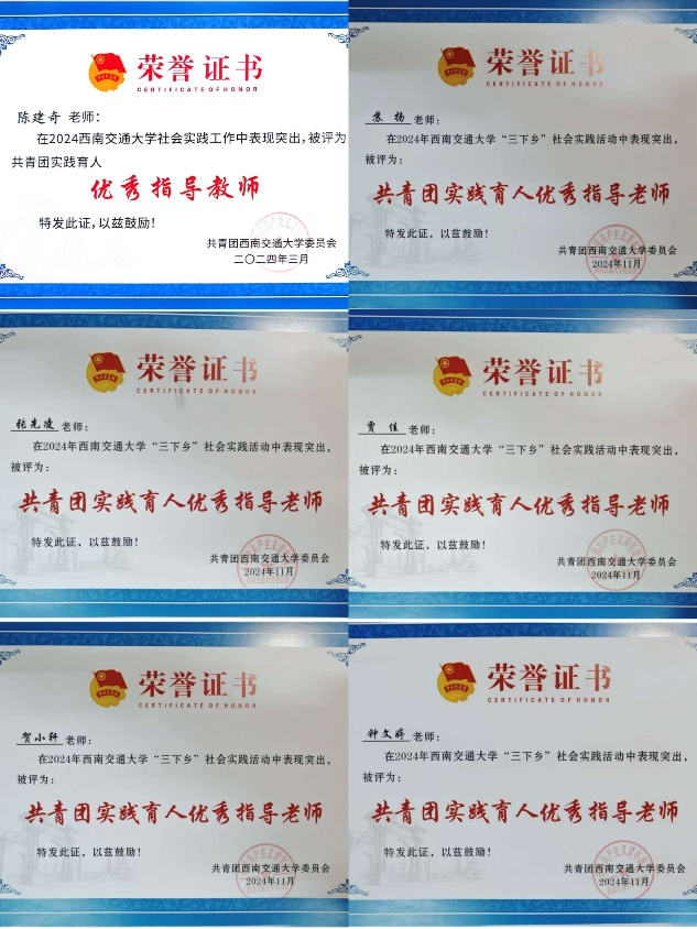 2024年“青鸽志愿服务队”培育孵化的“有爱助无碍,执善而为善——助残扶弱新模式”“语相通,心相连——以推普助力乡村振兴”系列实践项目分别荣获第十四届“三创赛”四川省赛“二等奖”、“三等奖”;“挑战杯”校赛“银奖”、“铜奖”;中国国际大学生创新大赛校级“金奖”、“铜奖”。同时,“语相通,心相连——以推普助力乡村振兴”实践项目还被评选为西南交通大学第十六届课外科技创新实验竞赛活动(L-STIC)的金奖作品,指导老师陈建奇被评选为特殊贡献指导老师。