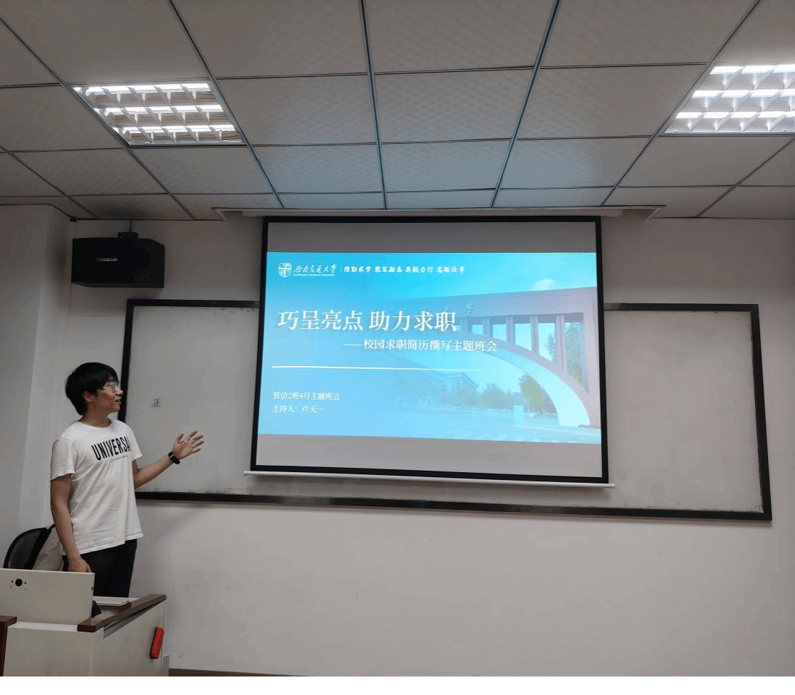 本科2023级管信2班“巧呈亮点,助力求职”校园求职简历撰写主题班会在J0316正式开展。参加本次主题班会的嘉宾有辅导员苏扬老师、班导师杨斐老师、院友导师范宇宸老师、院友导师朱琳老师。本次主题班会分为以下4个部分:简历撰写要点及雷区、创业经验分享、面试官分享简历撰写与面试技巧和总结与展望。本次班会由班长卢天一主持。