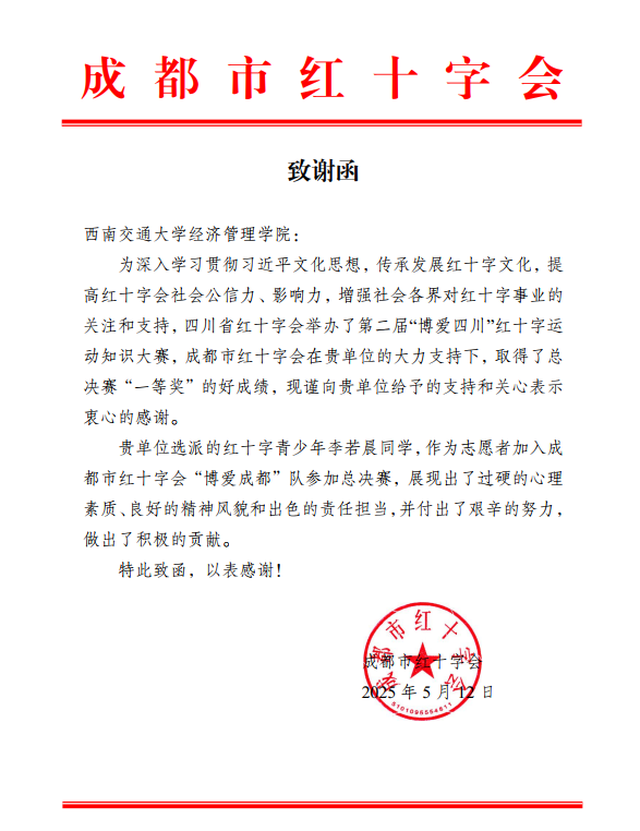 为庆祝中国红十字会成立121周年,四川省红十字会开展了第二届“博爱四川”红十字运动知识大赛,由西南交通大学李若晨作为队长,成都东软易游体育