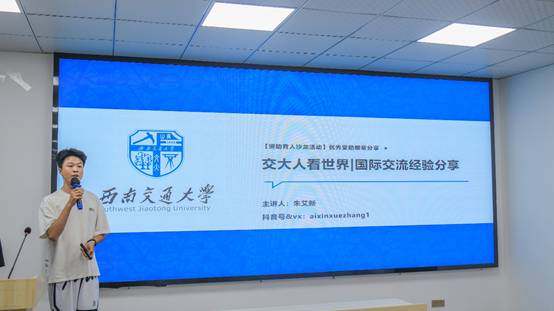2021级本科生朱艾新,竢实扬华奖章获得者,受助参加了2025年寒假“助梦启航”天睿国际教育奖学金研学项目。他分享了寒假时去日本研学的国际交流经验与自身成长经历,激励同学们借助资助的力量,勇敢走出舒适区,拓宽视野,提升自我。