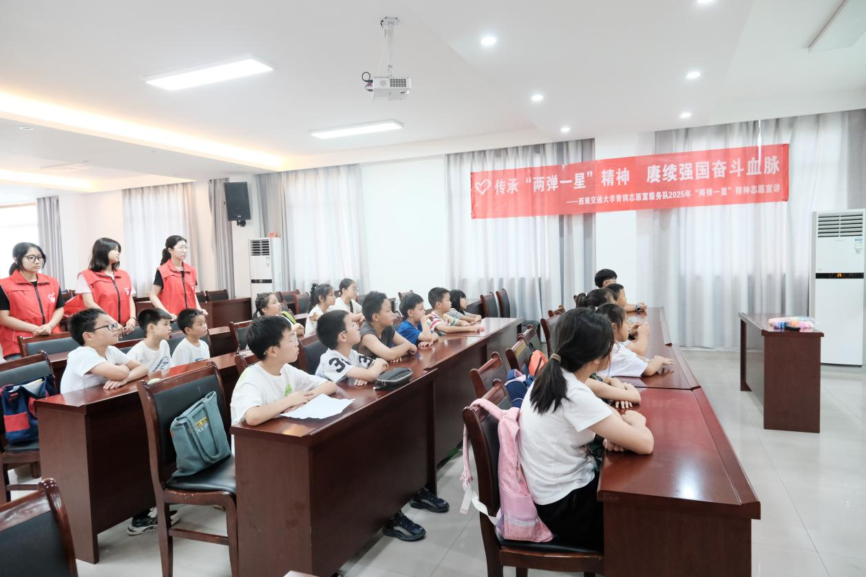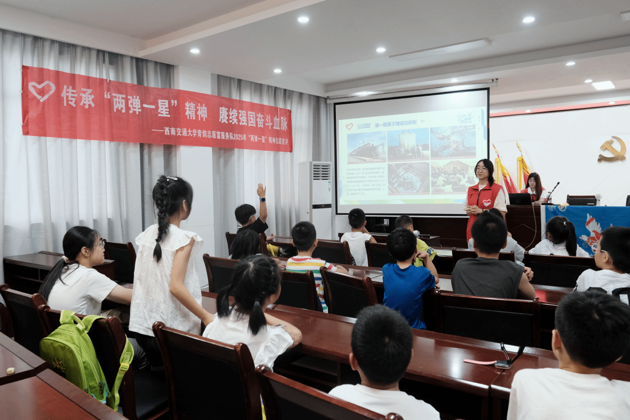 为弘扬“两弹一星”精神,传承老一辈科学家爱国奉献的崇高品格,7月9日上午,西南交通大学“两弹一星”精神宣讲青鸽志愿服务队成员在郫都区安靖镇喜安社区开展2025年“两弹一星”精神志愿宣讲活动。