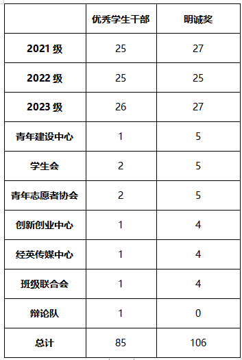 (2)三好学生标兵、三好学生、优秀学生干部、明诚奖名额分配如下: