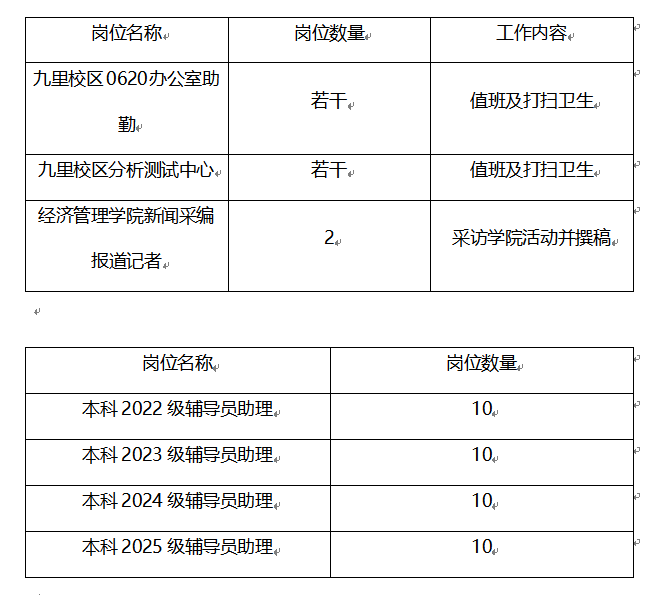 (本次招聘不面向2025级新生,新生勤工助学岗位招聘将在学校困难认定结果出来后进行。)