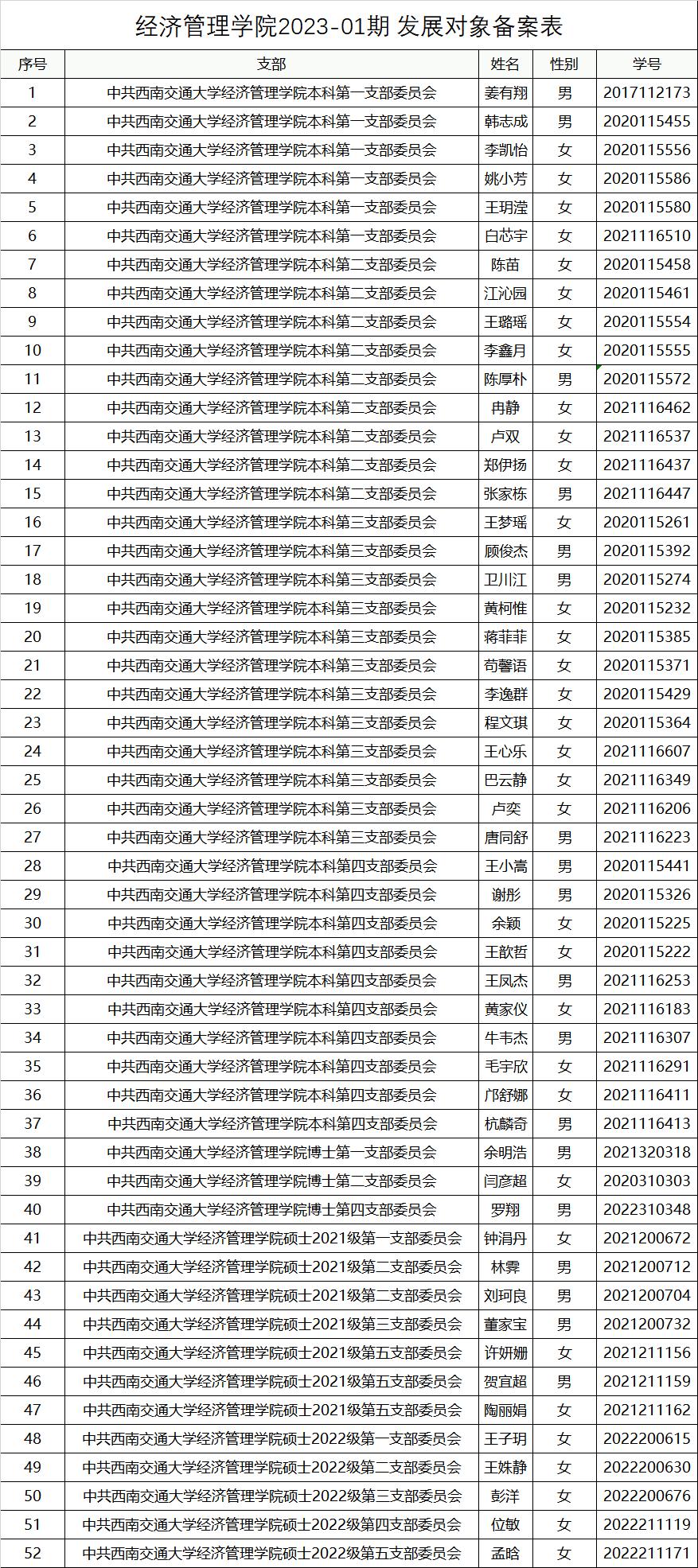 根据《中国共产党支部工作条例(试行)》《中共西南交通大学委员会基层党组织建设工作文件汇编》的有关规定,经过相关党支部全面了解、考察,并经院党委审核,拟将以下52位同志确定为易游体育官方网站 党委2023-01期党员发展对象,现予以公示。