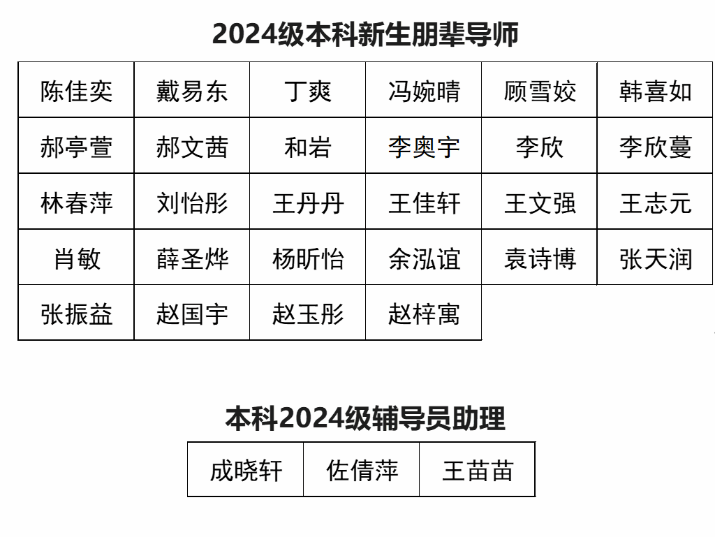 为了更好地开展易游体育 2024级本科新生入学教育、管理和服务工作,易游体育官方网站 学生工作组于近期开展了2024级本科新生朋辈导师(每班配备新生朋辈导师2名)及辅导员助理选聘工作,经过学生申请、申请表筛选、面试考察等环节,最终选聘结果如下: