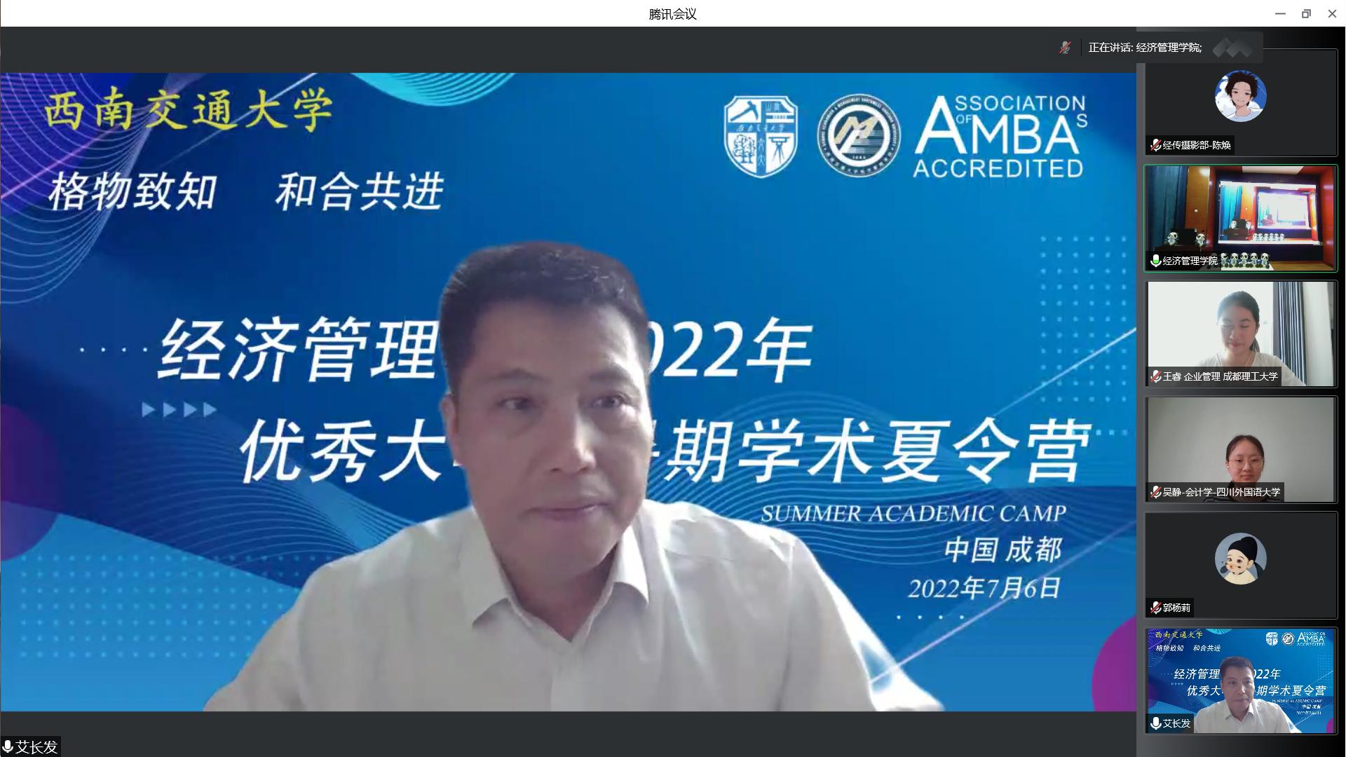 西南交通大学研究生院副院长艾长发教授首先致开幕词。他对参加此次线上暑期学术夏令营活动的同学们表示热烈欢迎。艾长发以饱满的热情为大家介绍了学校简况,并提出殷切期望,希望学子们能潜心学术研究,走向美好的未来。