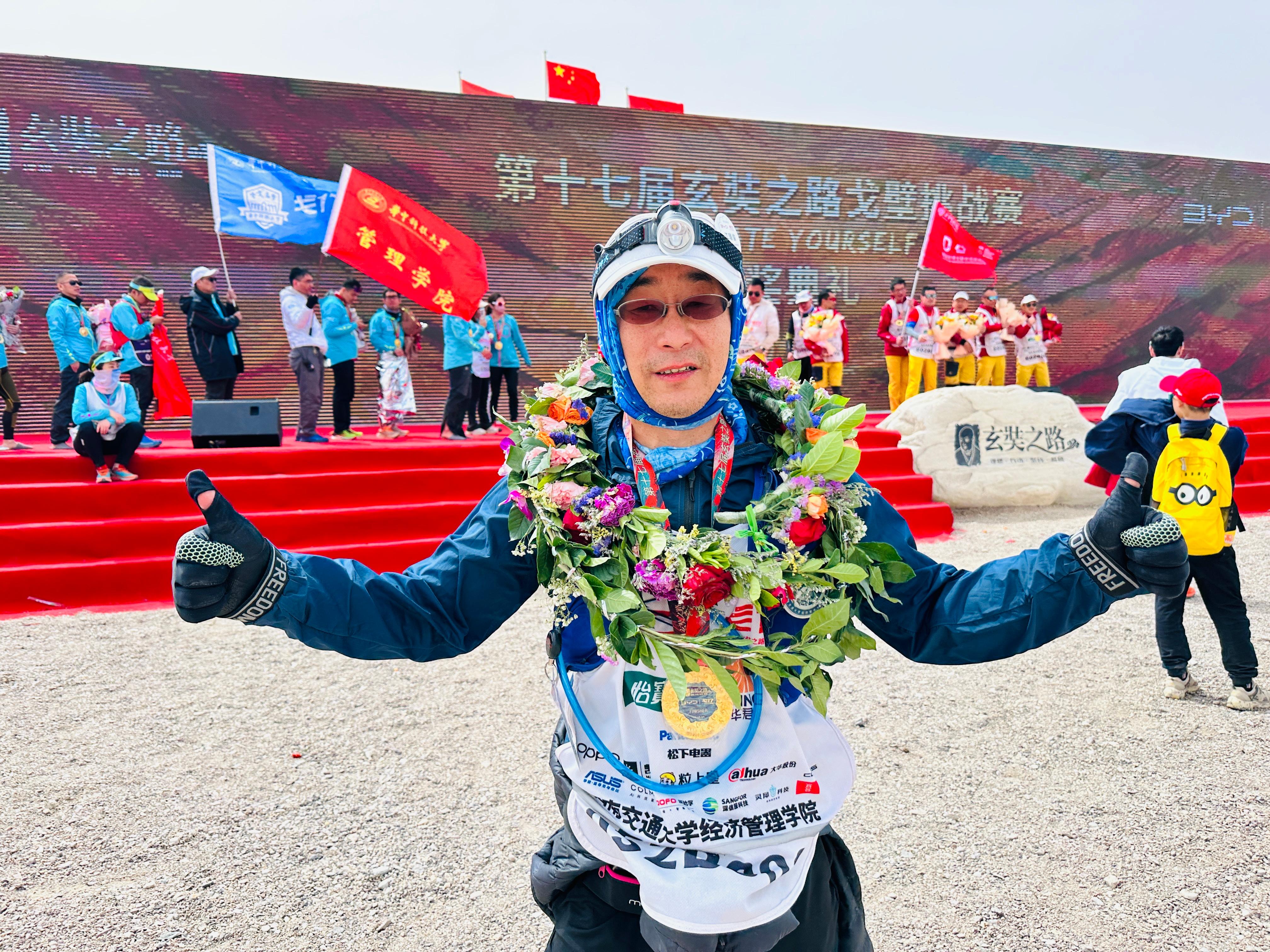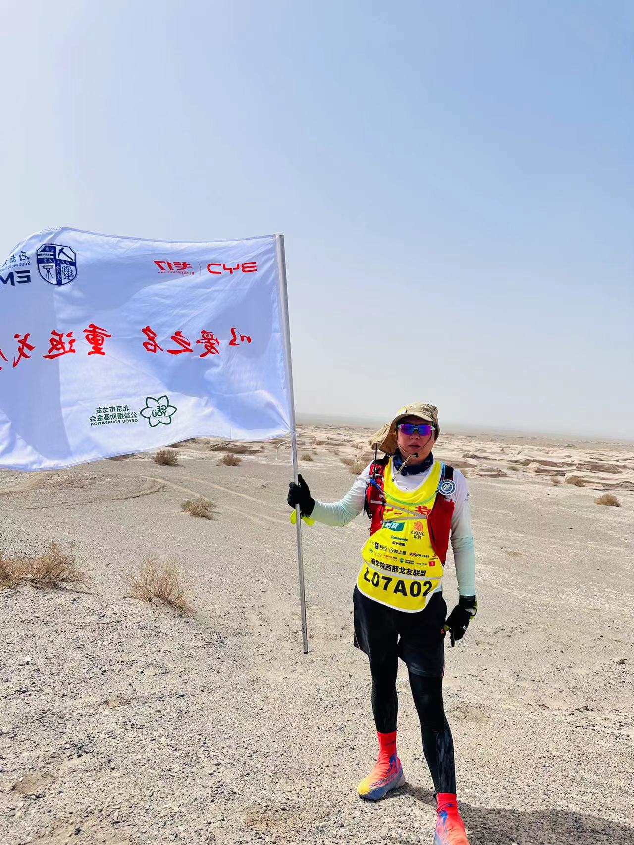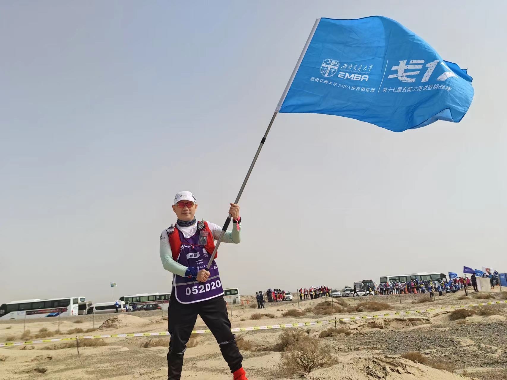 戈赛A+组是玄奘之路戈壁挑战赛最难的组别,选手需在22小时内跑完其他选手在四天三夜内完成的121公里路程,全程需要自补给、自导航,日夜兼程。今年的戈赛,天气异常突变和恶劣,昼夜温差大,风沙肆虐到一度熔断A+的赛程,完赛率只有36%。拓守盛校友以超人的意志力只用了16小时完成比赛。他身披易游体育