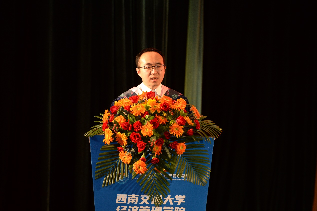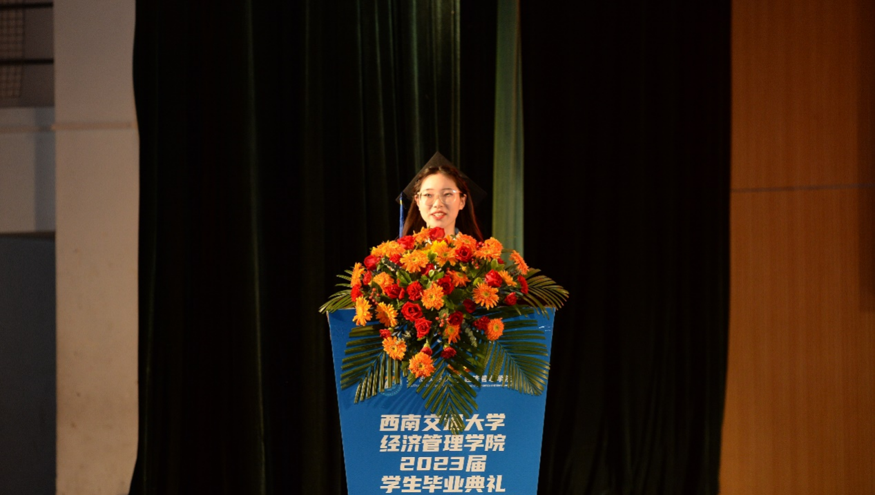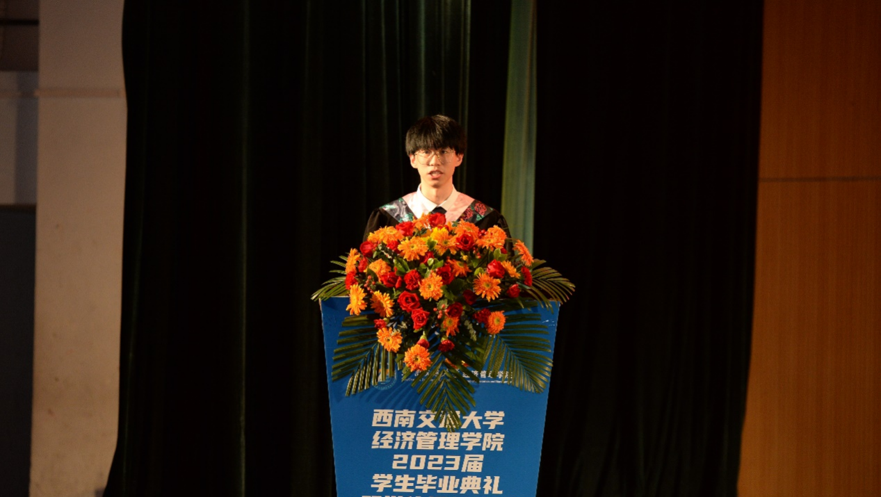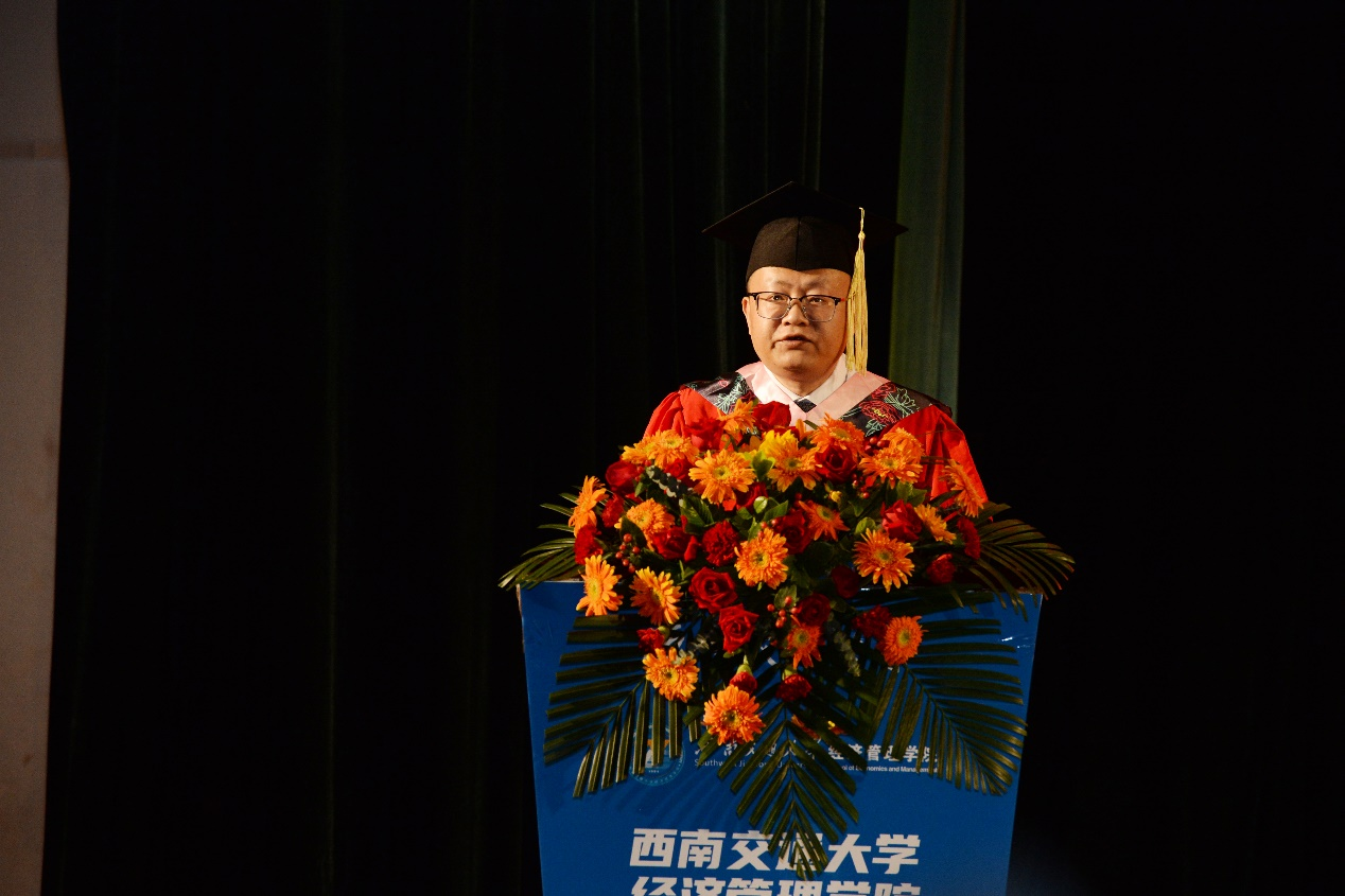 全体师生,向2023届全体毕业生同学表示热烈的祝贺!他表示,经管学子们是民族的希望,也是国家的未来,在追逐梦想中要勇于在不断试错中淬炼品质、磨炼意志,以豁达的胸怀容纳潮起潮落,以坚韧的心态直面失意挫折。他回顾同学们在三年疫情中的奋勇拼搏与无私奉献,希望同学们能够时刻保持“千磨万击还坚劲”的坚定意志,坚守自己的理想信念,学会在逆境中寻求出路,在坎坷中放平心态,尽情施展自身才华,为社会发光发热。希望同学们时刻谨记校训、院训,发扬交大精神,展现交大学子的担当。郭院长深情的字字句句,都寄托着对全体毕业生们的深情嘱托与美好祝愿。