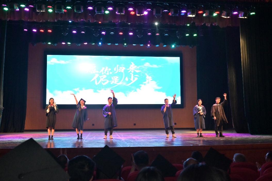 毕业典礼MV播放完后,便是将典礼氛围进一步推向高潮的歌曲快闪。本科毕业生谭妍伶与付宇钊、硕士毕业生文静柯与张皓越、MBA毕业生郑倩与陈楠六位同学共同演唱了《蒲公英的约定》与《凤凰花开的路口》。在悠扬歌曲旋律中,重温似水流年,倾唱出离别的不舍。
