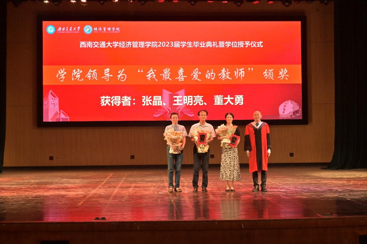 2023届本科毕业生评选的“我最喜爱的教师”名单,获得者是:张晶老师、王明亮老师、董大勇老师,并由王明亮老师作为教师代表为2023届毕业生致临别寄语。他在发言中,回顾了与同学们共同走过的39年风风雨雨,分享了陪伴同学们成长的点点滴滴,希望同学们在将来仍要积极努力,一定要做一个对社会、对集体、对家庭有责任感的人,彰显我们交大经管新青年的大格局、大情怀、大担当。