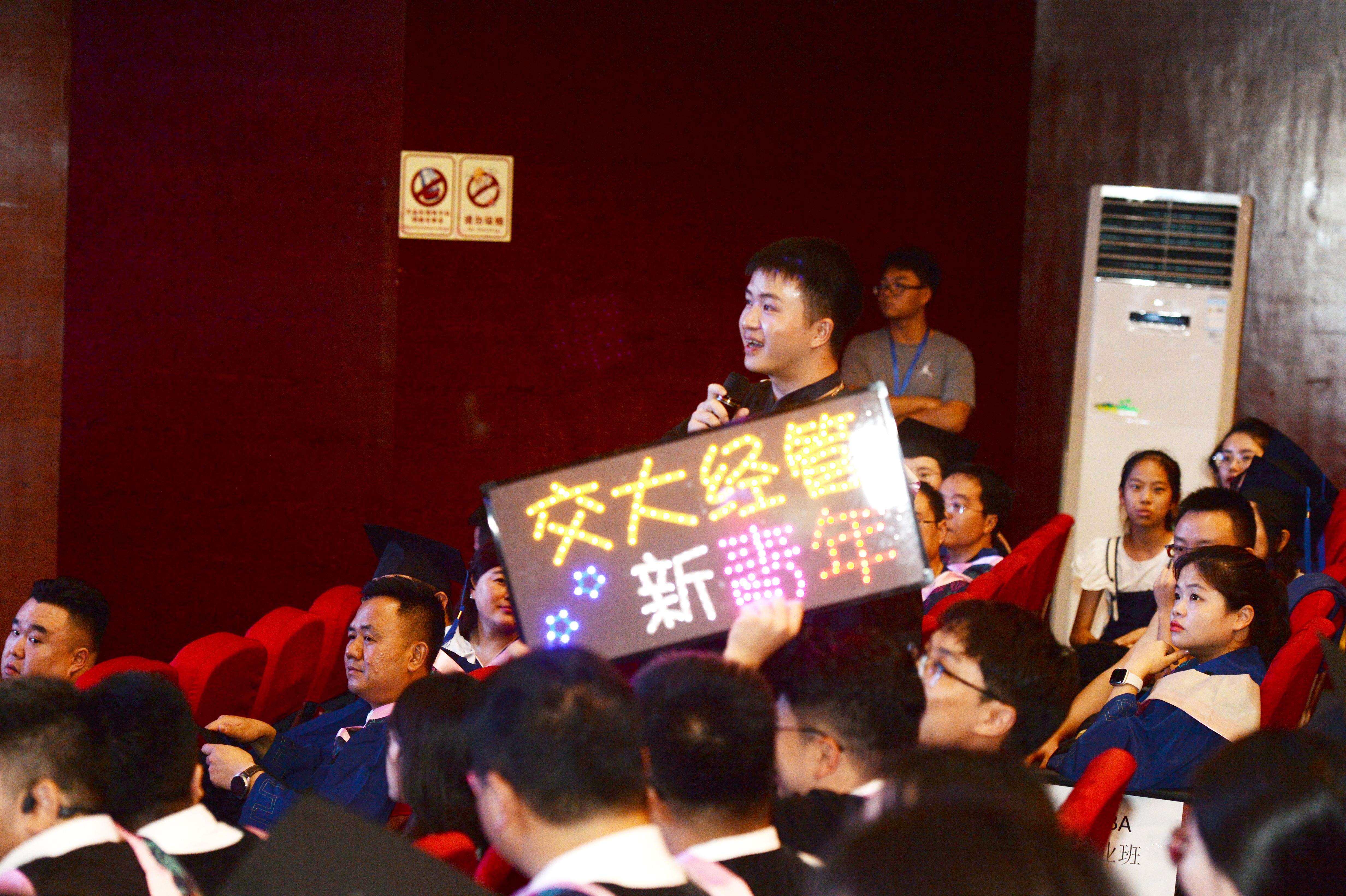 毕业典礼MV的播放,回顾了经管学子们从刚入校时的懵懂青涩,一步步历练成长,到毕业答辩时的游刃有余,满载归程。美好的学生时代,如春风拂过,都浓缩在这短短的几分钟,动人心弦。