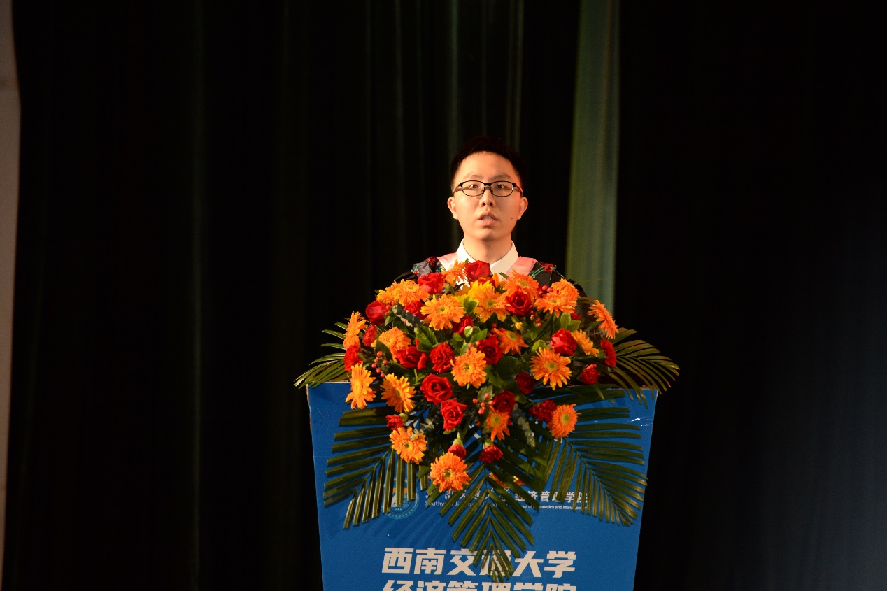 本科毕业生代表贺一鸣、硕士毕业生代表文静柯和MBA毕业生代表范宇宸上台发言,向母校诉说内心的千言万语,深表感恩之情。