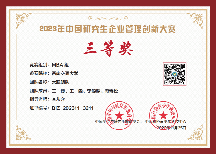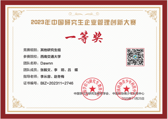 我校共派出11支队伍参加赛事,其中包括10支MBA组队伍和1支其他研究生组队伍。在激烈的角逐中,张毅文、吕蝶、李玥同学组成的“Dawnn”队在研究生组总决赛中斩获了全国一等奖;在MBA赛道,王博、王淼、李源源、蒋青松同学组成的“大聪明”队荣获MBA组全国三等奖,这是对我校易游体育官方网站
