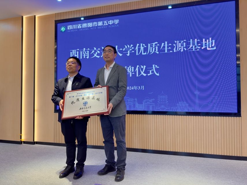 德阳五中党委书记唐永富代表德阳五中全体师生,对西南交通大学一行的到来表示热烈欢迎和衷心感谢。他表示能够成为西南交通大学的优质生源基地,既是对学校近年来在高质量生源输送所取得成绩的肯定,也为今后学校的拔尖创新人才培养模式提供了新的思考。陈岩峰处长随后向德阳五中授予“优质生源基地”。