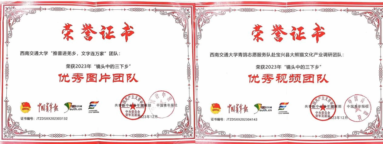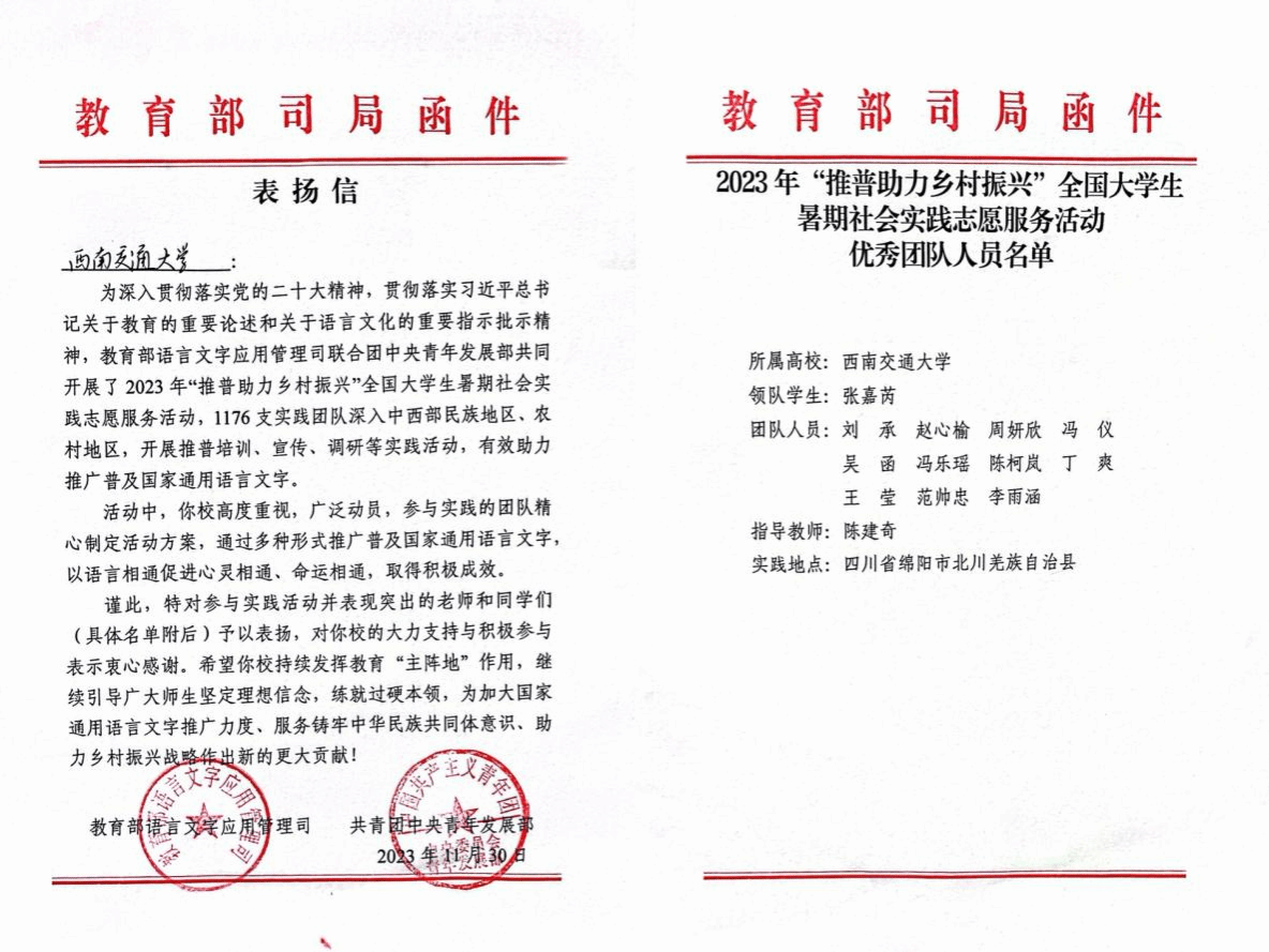 老师的悉心指导下,进社区、下农村、访群众,脚踏实地,深入基层开展异彩纷呈的实践活动,活动涉及新农村建设、文化传承、志愿服务等各个方面,实践队员边实践边学习边探索,在实践中历练了本领,淬炼了心灵,在全国各地发挥着自己的光和热。实践活动得到了当地政府、群众和社会各界的一致好评,取得了不错的成绩。2022年青鸽志愿服务队入选中国青年报评选的“全国大学生暑期百强实践团队”;2023年青鸽志愿服务队成功入选了由共青团中央青年发展部、中国青年报、中国青年网共同举办全国大中专学生志愿者暑期文化科技卫生“三下乡”社会实践“镜头中的三下乡”活动“优秀图片团队”和“优秀视频团队”,同时团队还收到了来自教育部的表扬信!
