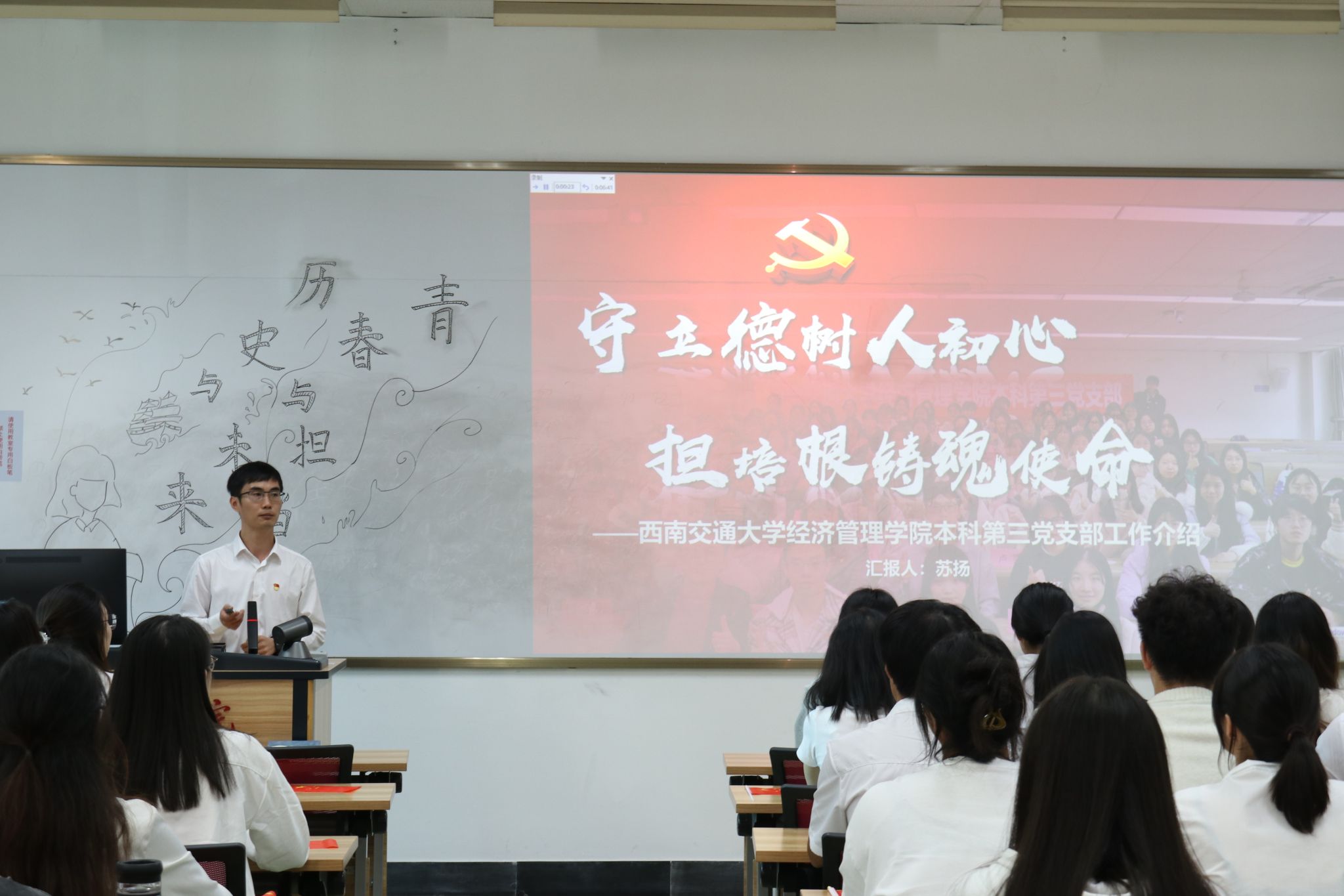 本科第三党支部书记苏扬同志分别针对各自支部的工作特色与亮点进行分享。张宇同志从党建引领学生社区育人新业态和榜样领航青年行、共建一流聚力量两个方面展开介绍了党支部工作;苏扬同志则先简要介绍了西南交通大学校史以及易游体育官方网站