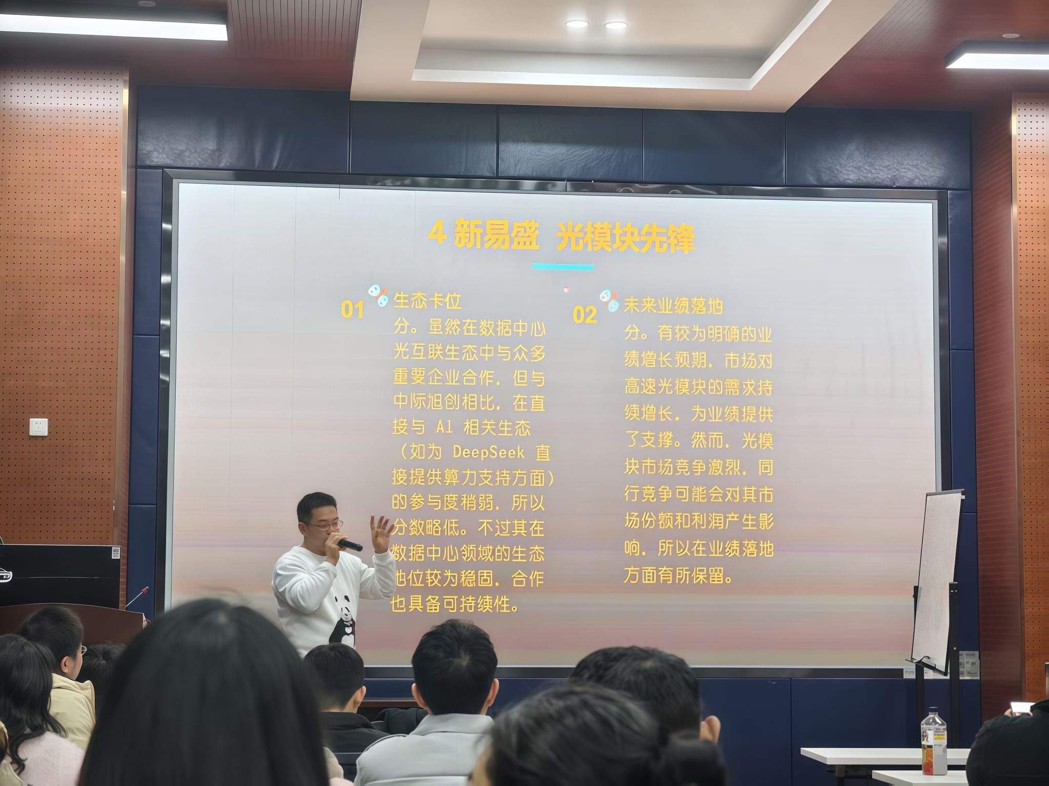 开展了题为“在十倍AI赛道选十倍股”的讲座。本次讲座以DeepSeek为代表的人工智能产业崛起为切入点,旨在通过剖析AI前沿技术应用以及相关产业链,为学生投资实践与未来职业发展提供帮助。本次讲座由易游体育