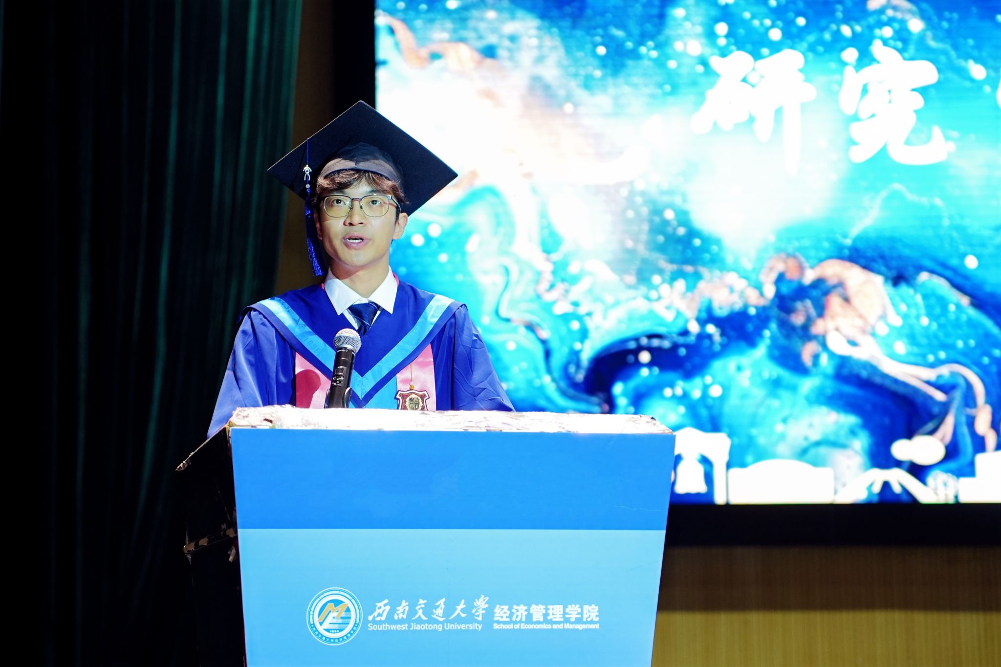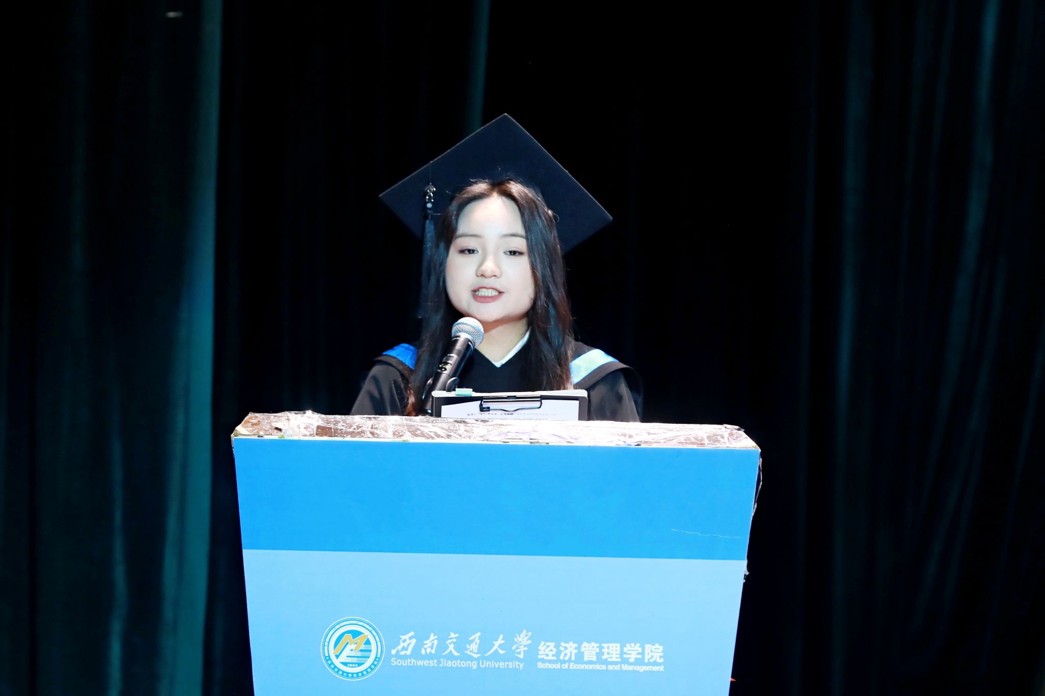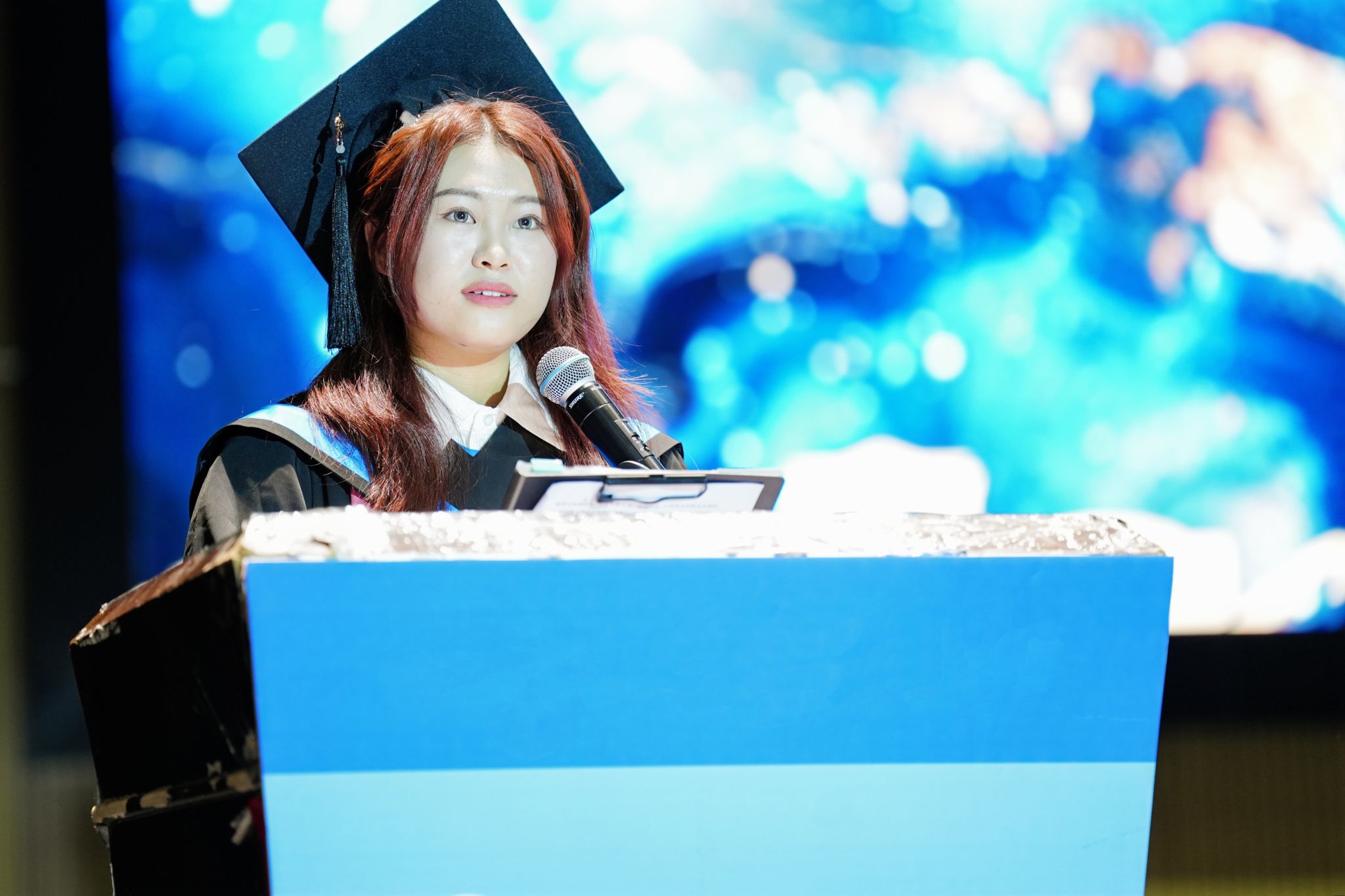 本科生毕业生代表毛宇欣、研究生毕业生代表李若晨、MBA毕业生代表张永恒分别发言。毛宇欣回顾了自己从懵懂到成熟的大学成长经历;李若晨分享了自己在硕士阶段学术研究、实践工作等方面获得的能力提升和成长;张永恒分享了自己奔走在课堂与职场之间的求学之路,不忘初心、拥抱挑战,在前行中连接彼此、照亮他人。毕业生代表真情实感的流露,饱含着对易游体育