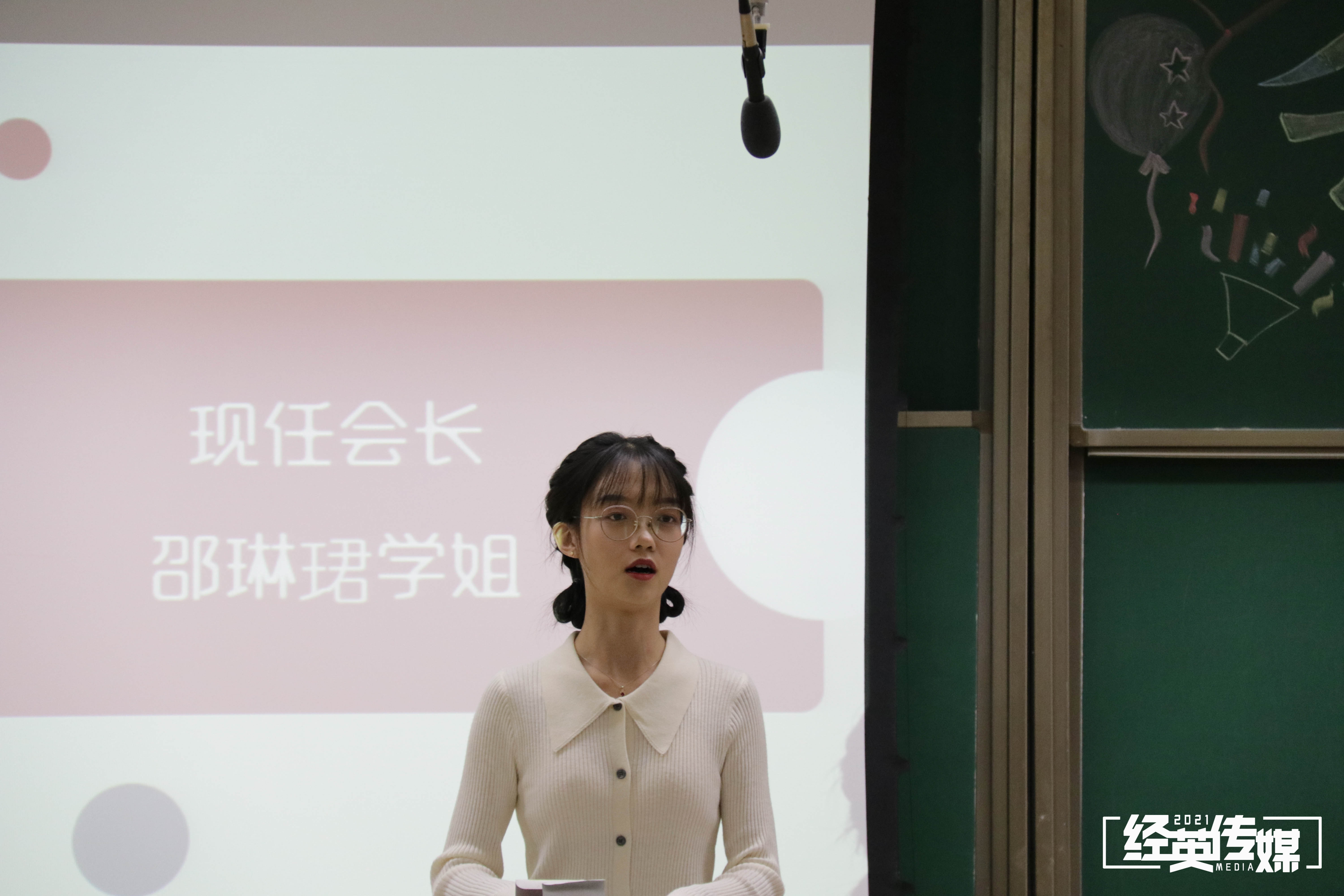 视频结束之后便是经管青协前任会长钱智超同学和现任会长邵琳珺同学的发言。他们都表达了对于自己曾经参加青年志愿者活动的怀念以及对于新会员们的鼓励与期待,并希望新会员们在今后的日子里通过参加志愿活动以提升自己并帮助自己创造美好回忆,将志愿者的路走下去收获不一样的青春。遗憾的是经管青协的指导老师陈建奇因事缺席,但也同样通过会长邵琳珺同学之口表达了对于新会员们的期望与欢迎。