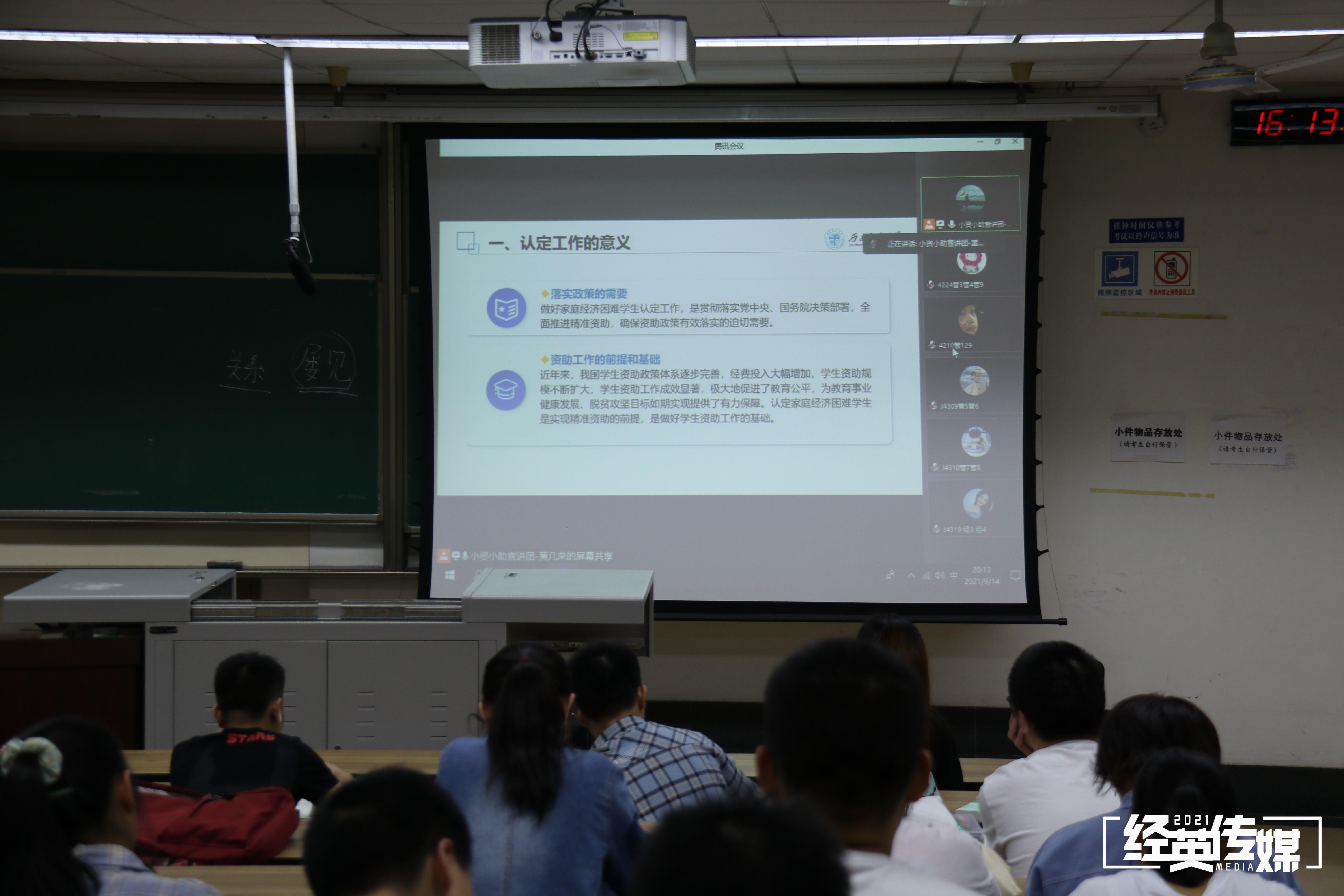 为新生开展家庭经济困难学生认定工作介绍,小资小助宣讲团黄几荣担任主讲人,以线上形式为新生们讲解。