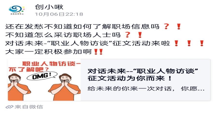 创新创业中心举办了“对话未来”-职业人物访谈征文活动。职业人物访谈,是通过与一定数量的职场人士会谈而获取关于一个行业、职业和单位“内部”信息的一种职业探索活动,是大学生职业选择和职业定向的一个自助平台,是在校大学生了解和认识社会需求、职业需求、职业环境和基本状况的有效方式。这些信息能够帮助在校大学生正确认识自己的优势和不足,从而制定合理的职业生涯规划。