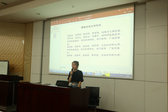大三学生安静泽同学的指导下,学唱西南交通大学校歌。在学习之后,新生们纷纷感叹歌词寓意深厚,曲调激昂。熟悉了旋律之后,同学们整齐地合唱了校歌。紧接着,安静泽同学带领大家观看《我和我的祖国》视频,并学唱《我和我的祖国》,新生们对这首歌的旋律都很熟悉。最后,大家一起慷慨激昂地合唱这首歌曲。