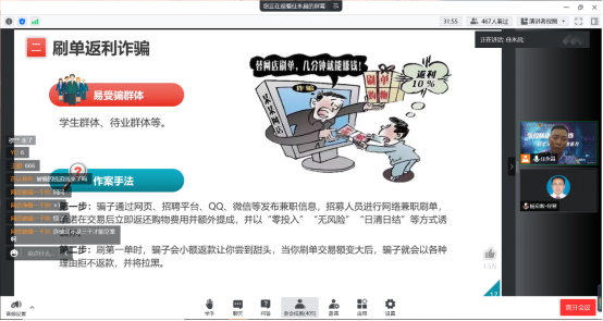 联合九里堤派出所民警为本科、研究生新生开展了一场线上防电信诈骗主题讲座。本次讲座邀请到了九里堤派出所具有多年防诈经验的民警赵小磊主讲,易游体育官方网站