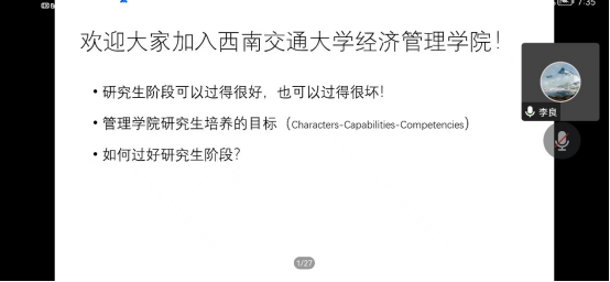 的师生们一起取得更好的成绩。对于初入校的研究生们,李老师首先谈到了研究生阶段与本科阶段的异同点,鼓励大家尽快找准定位,走入研究生生活的正规。对此,李老师分享了“3C”理论,即characters-capabilities-competencies,希望新生们注重培养个人能力、提升自身素养,度过一个充实的研究生阶段。李老师称这个阶段的个人发展是没有上限的,它有无穷的可能,鼓励大家将最好的青春用来做最有意义的事情。