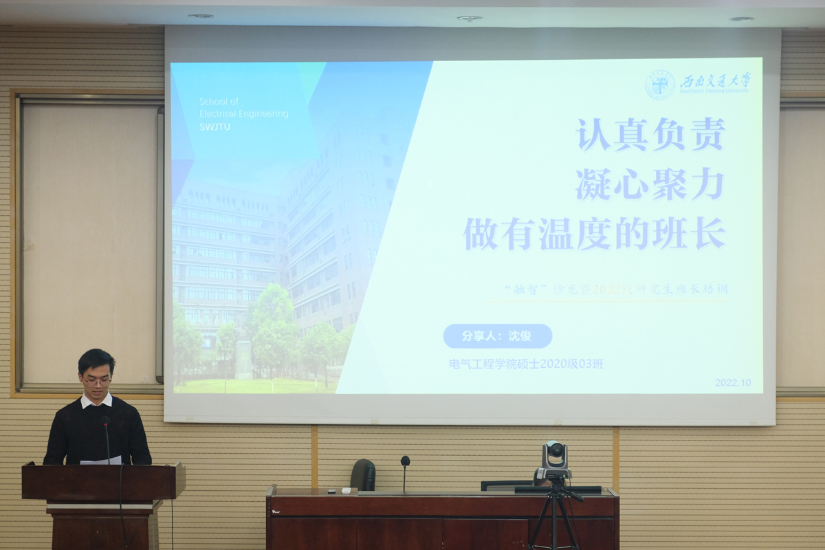 研究生忠忱班集体的20级三班班长沈俊进行了班级建设经验分享。他指出对于班委管理制度要组织健全,分工合作;评奖评优制度要做到公平、公正、有效;通知宣传制度必须及时有效;要发挥班长作用,组织协调,知人善用。做好班级的各项事务是班级建设的基础。